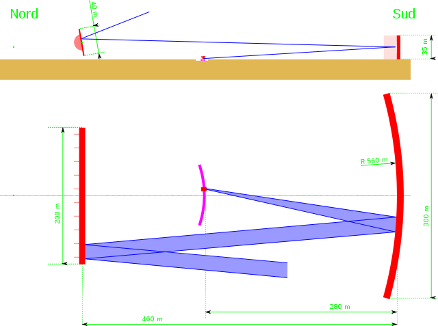 Les ondes radio arrivent d'abord sur un miroir plan de 20m sur 400m en grillage d'un maillage d'un demi pouce (environ 1,7cm) composé de 10 panneaux orientables. Elles sont réfléchies sur un miroir sphérique de 35m sur 300m qui les concentrent sur une antenne mobile car le foyer d'un miroir sphérique se déplace. Cela leur permet d'avoir un temps d'acquisition d'environ une heure.