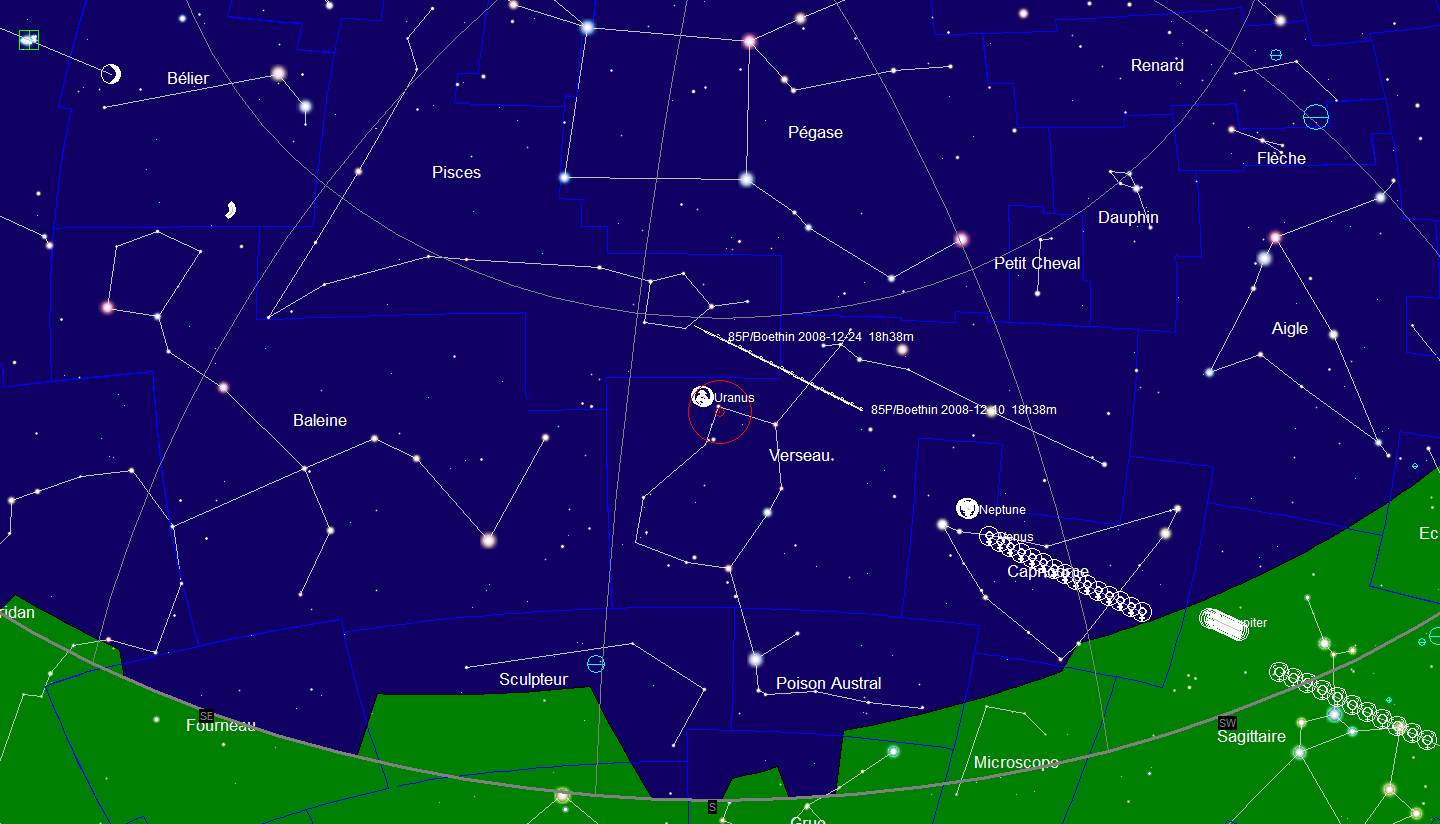 En effet, si vous vous mettez à votre balcon ce mois de décembre et que vous visez la tête du Poisson avec les jumelles que vous aurez eus à Noël, vous trouverez sans doute la comète 85P Boethin, de magnitude 7,5... C'est à dire pas facile mais faisable. Et Certainement plus accessible encore au télescope. Assez haute sur l'Horizon, donc du genre qui se tente.