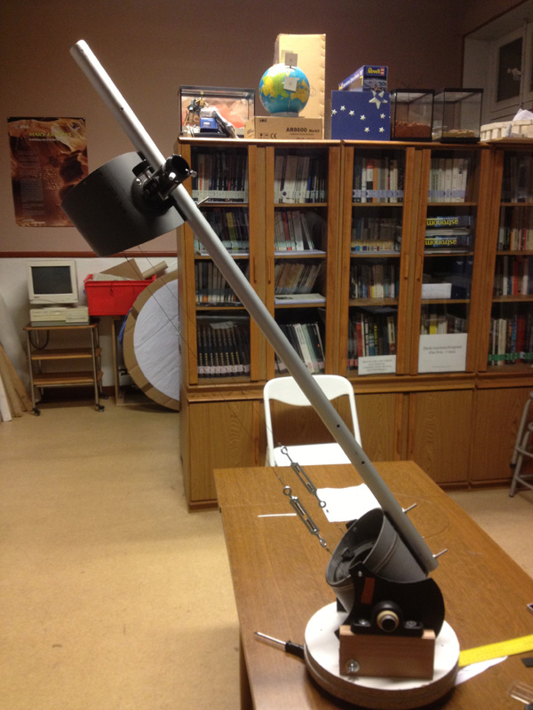 Le problème qui se pose maintenant est celui de la stabilité du télescope lorsqu'il n'observe pas au Zénith !!! Il a tendance a basculé. Plusieurs hypothèses ont été émises et la solution adoptée quasiment à l'unanimité est de fabriquer quatre pieds disposés en croix sous le télescope. Olivier est chargé de trouver ce qu'il faut pour la prochaine fois.