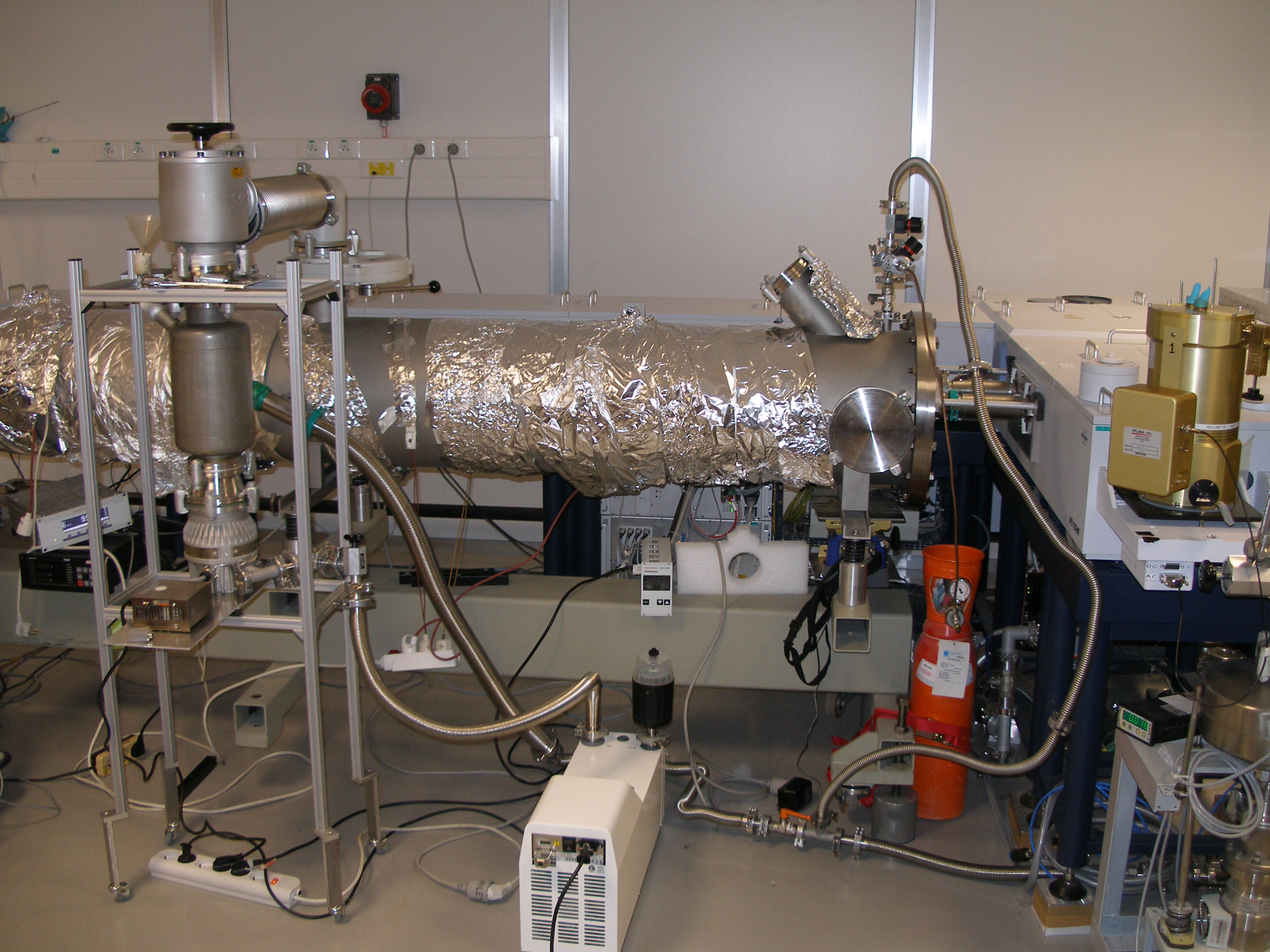 La cuve de mesure, la bouteille de méthane dijonnaise (en orange), une partie du système de pompage et le détecteur (bolomètre) en jaune :