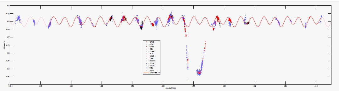 Don pense qu'on doit maintenant pouvoir caractériser ce système, plusieurs observateurs ayant de très bons résultats (certains sur le graphique sont aberrants, il ne faut pas en tenir compte, l'AAVSO ne filtre pas et les softs, en automatique, expédient n'importe quoi ! ).