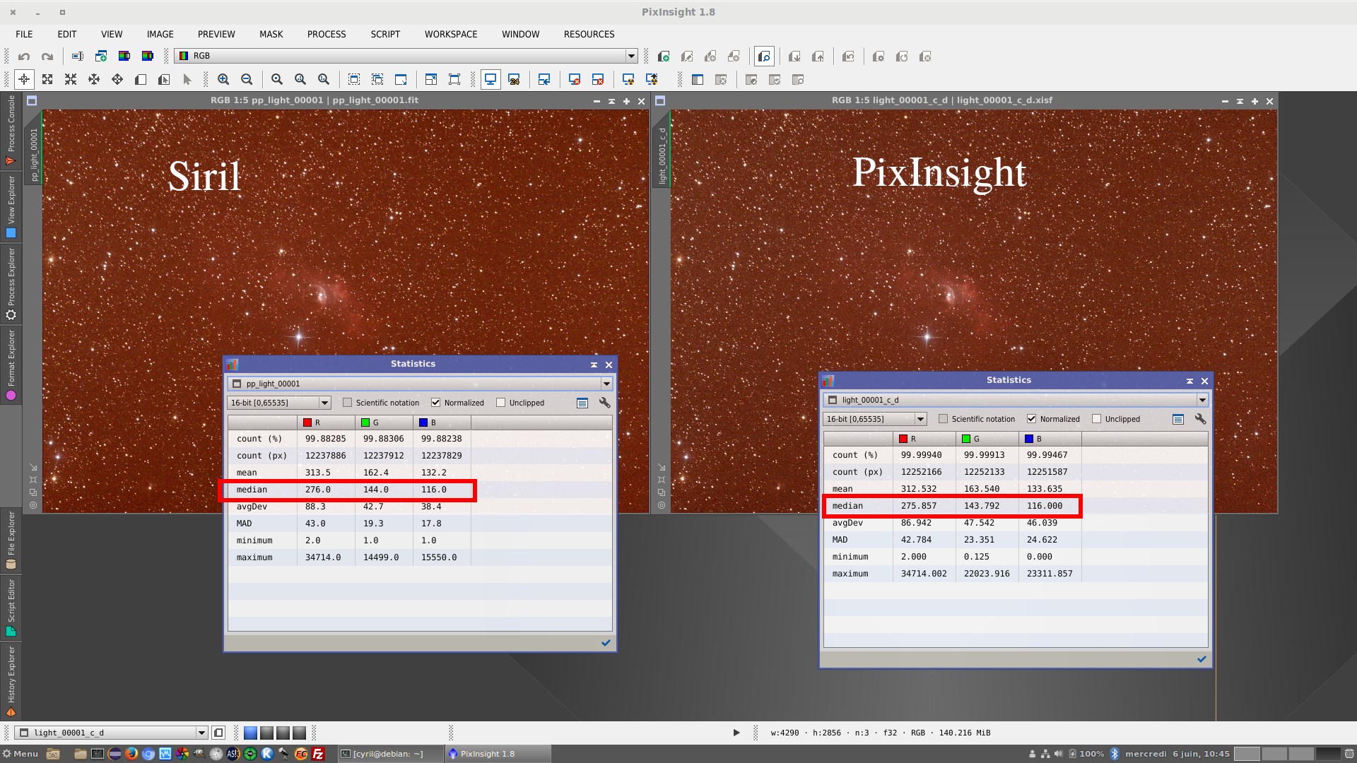 Un collègue de l'AAVSO qui utilise ma technique de photométrie VSF (APN) vient de faire un essai avec SIRIL. Il a découvert que les flats APN (donc RGB) n'y sont pas normalisés ce qui détruit la calibration couleur. Sous IRIS ce n'est pas le cas, la procédure GRAY_FLAT assure cette normalisation. C'est évidement le cas sous mon propre soft sous une forme un peu différente où la normalisation est faite sur une zone centrale de l'image (le vignettage peut être un peu différent en fonction de la couleur).