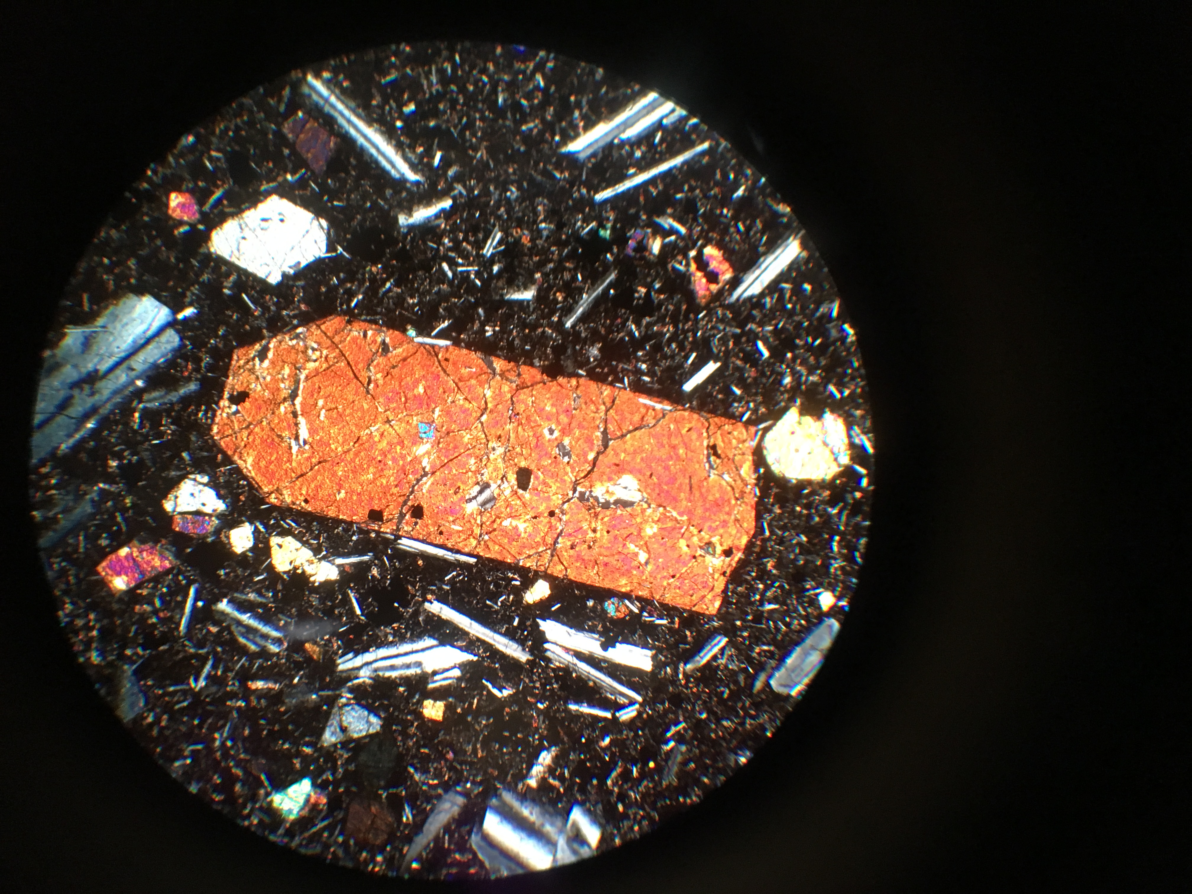 Je crois voir des plagioclases (en tout cas des feldspaths) en forme de baguette dans une matrice fine mais les gros "grains" sont ils des clinopyroxènes, ou de l'olivine ou ??