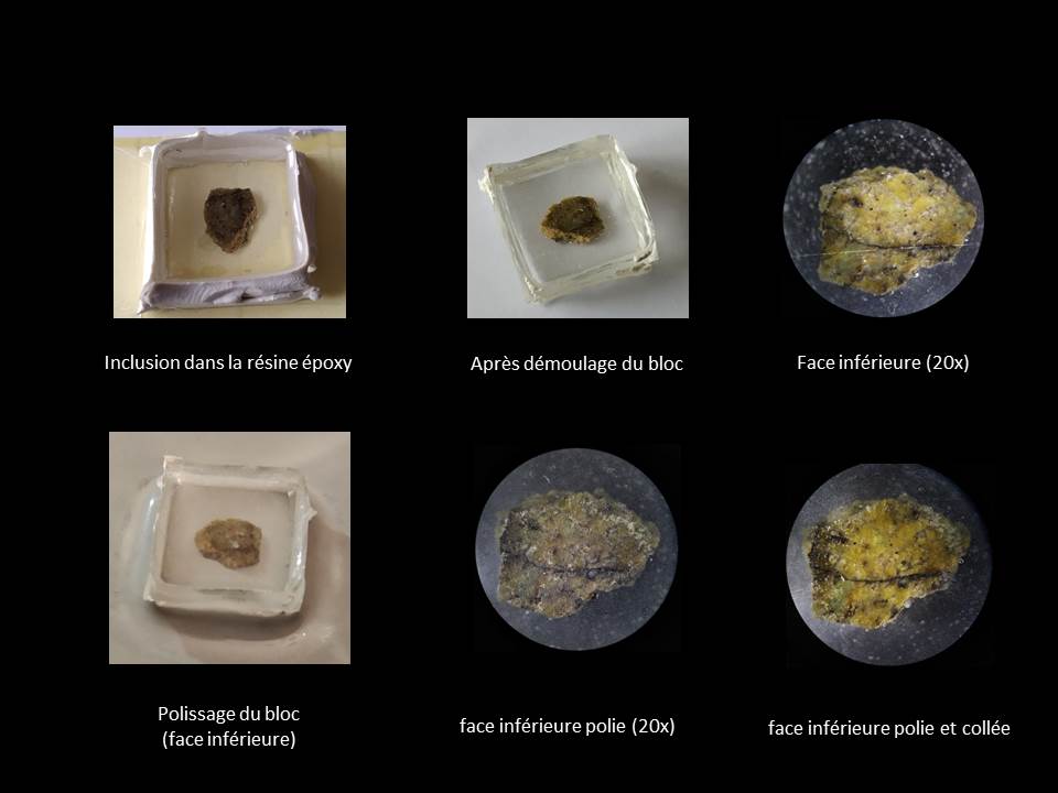 Sa fabrication a été particulièrement difficile (le fragment de départ faisant quelques mm de côté, il a fallu l'inclure dans un bloc de résine pour pouvoir le manipuler, le polir, le coller, l'amincir, etc ...). Dur labeur mais le résultat en valait la peine.
