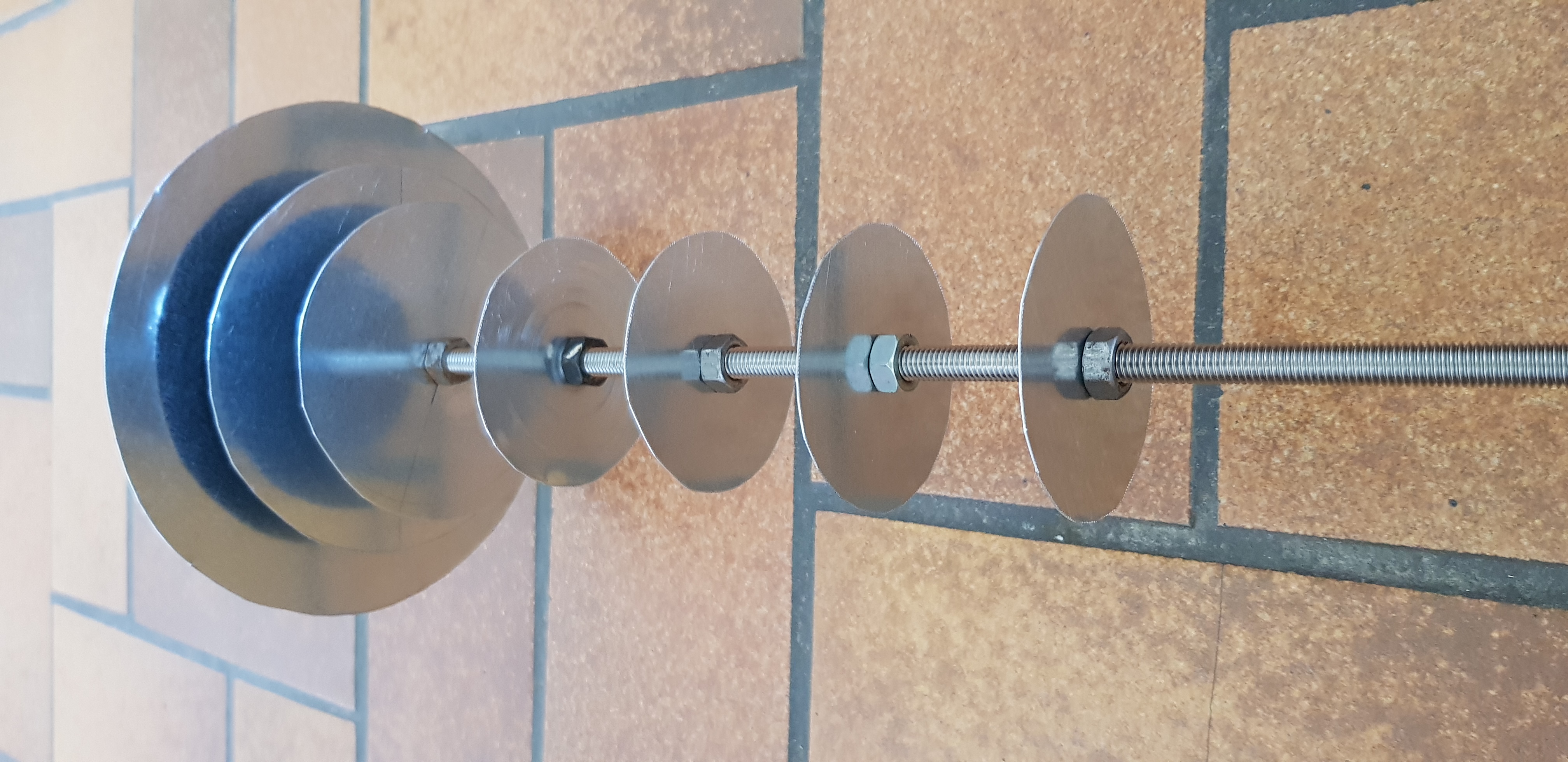 Voici le début de construction. Tous les éléments sont métalliques : tige filetée inox / boulons ferraille / Disques en acier zingué découpés dans une plaque de 0,8mm (pas facile à découper !). J'espère que la nature des métaux différents n'engendrera de parasites dues à un phénomène de pile.
