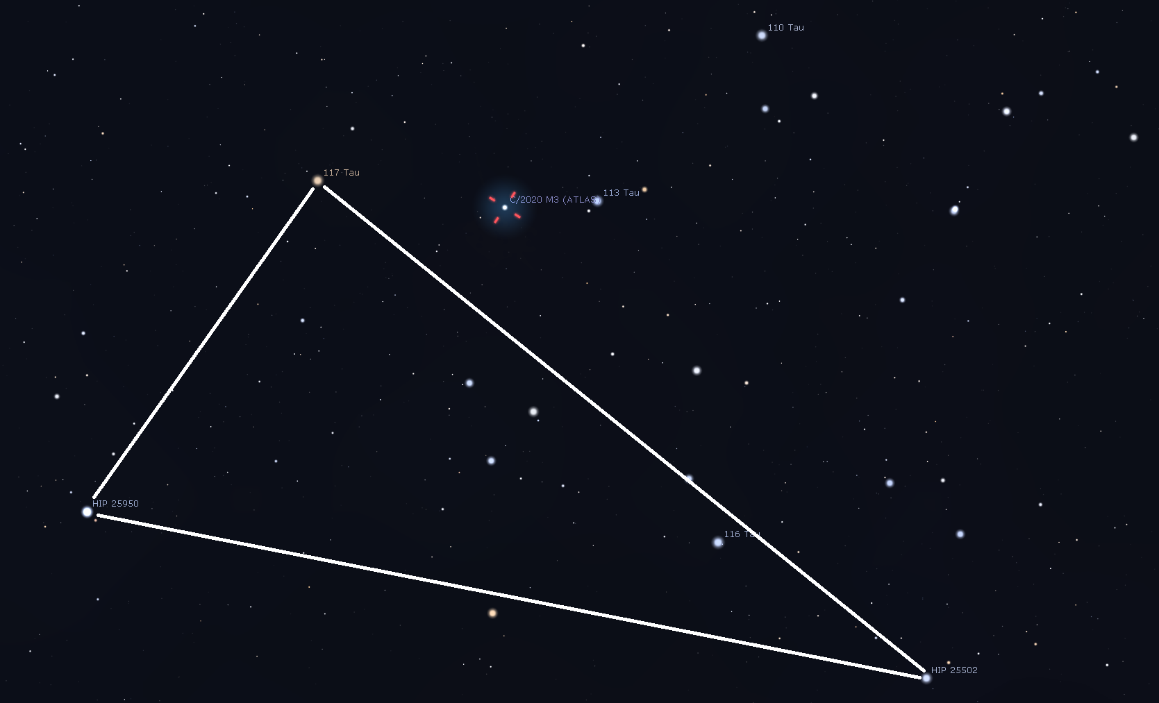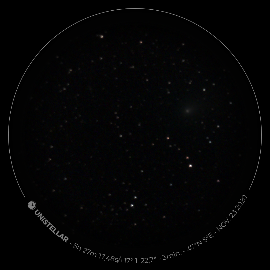 Bonsoir,Emile Touron a écrit : 05 déc. 2020 18:33 Il semble que c'est bien C/2020 M3. J'ai essayé de reproduire la scène sur Stellarium, pas évident, je ne suis pas sûr de moi !
