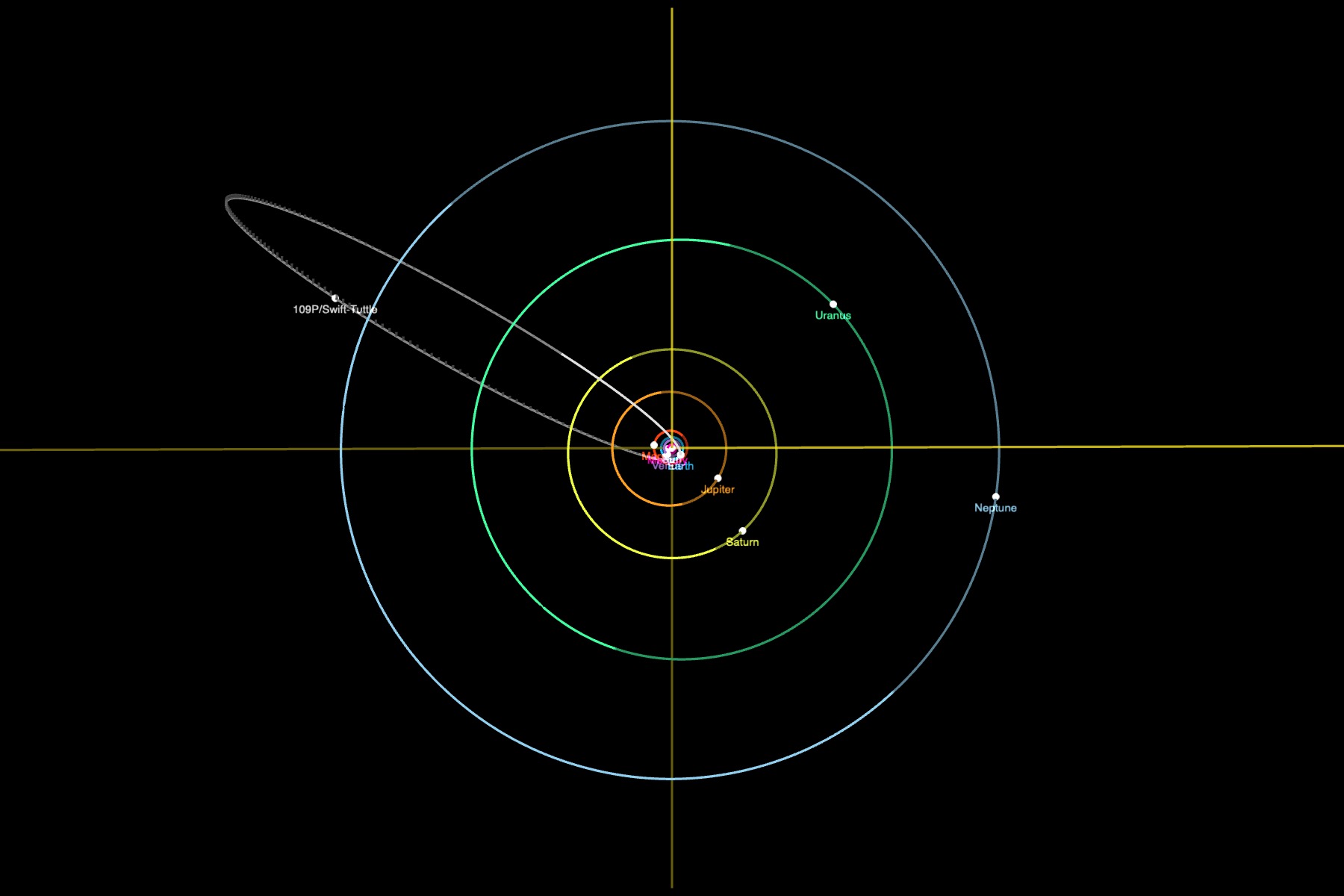 La comète 109P/Swift-Tuttle (période de 133 ans) est à l'origine des Perséides. Voici son orbite, donnée par le base de données du JPL (https://ssd.jpl.nasa.gov/sbdb.cgi) :