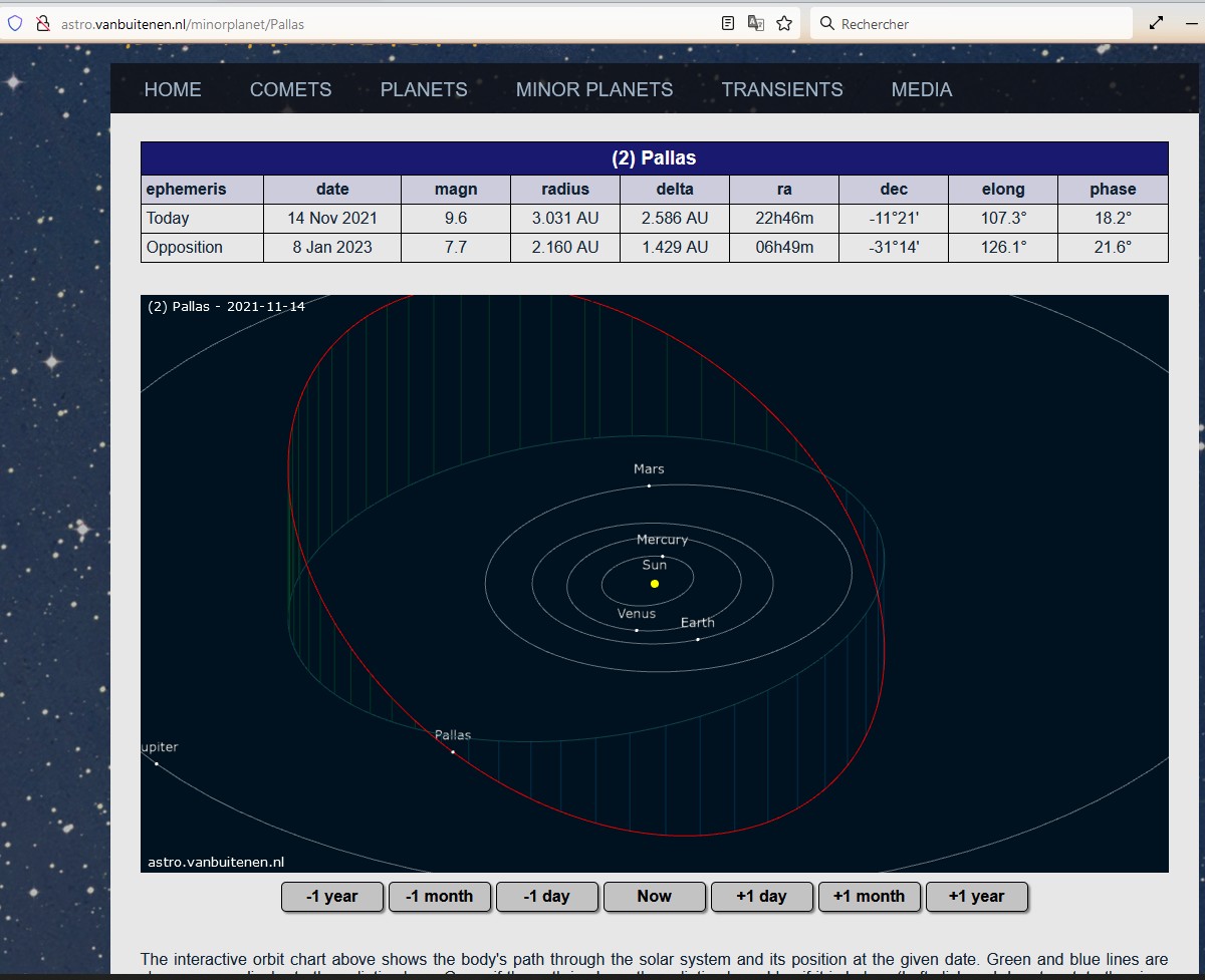 Exemple, après toutes les mises à jours habituelles, voici chez moi la position de Pallas ce soir à 22h local : Sinon (in english) il y a ce site très complet que tu connais sans doute :