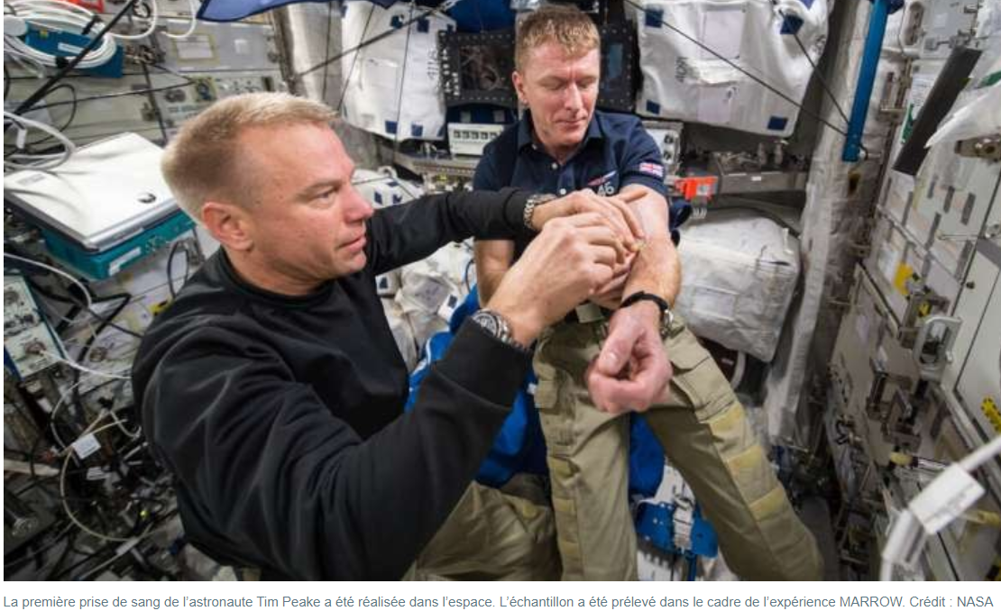 L'étude MARROW décrite dans cet article (https://phys-org.cdn.ampproject.org/c/s ... -cells.amp) tente de comprendre et résoudre l'origine de l'anémie (https://fr.wikipedia.org/wiki/An%C3%A9mie) spatiale, c'est à dire la perte plus élevée et continue de globules rouges appelée hémolyse (3 millions/s ou lieu de 2 millions/s sur Terre) dans notre corps lors d'un voyage spatial.