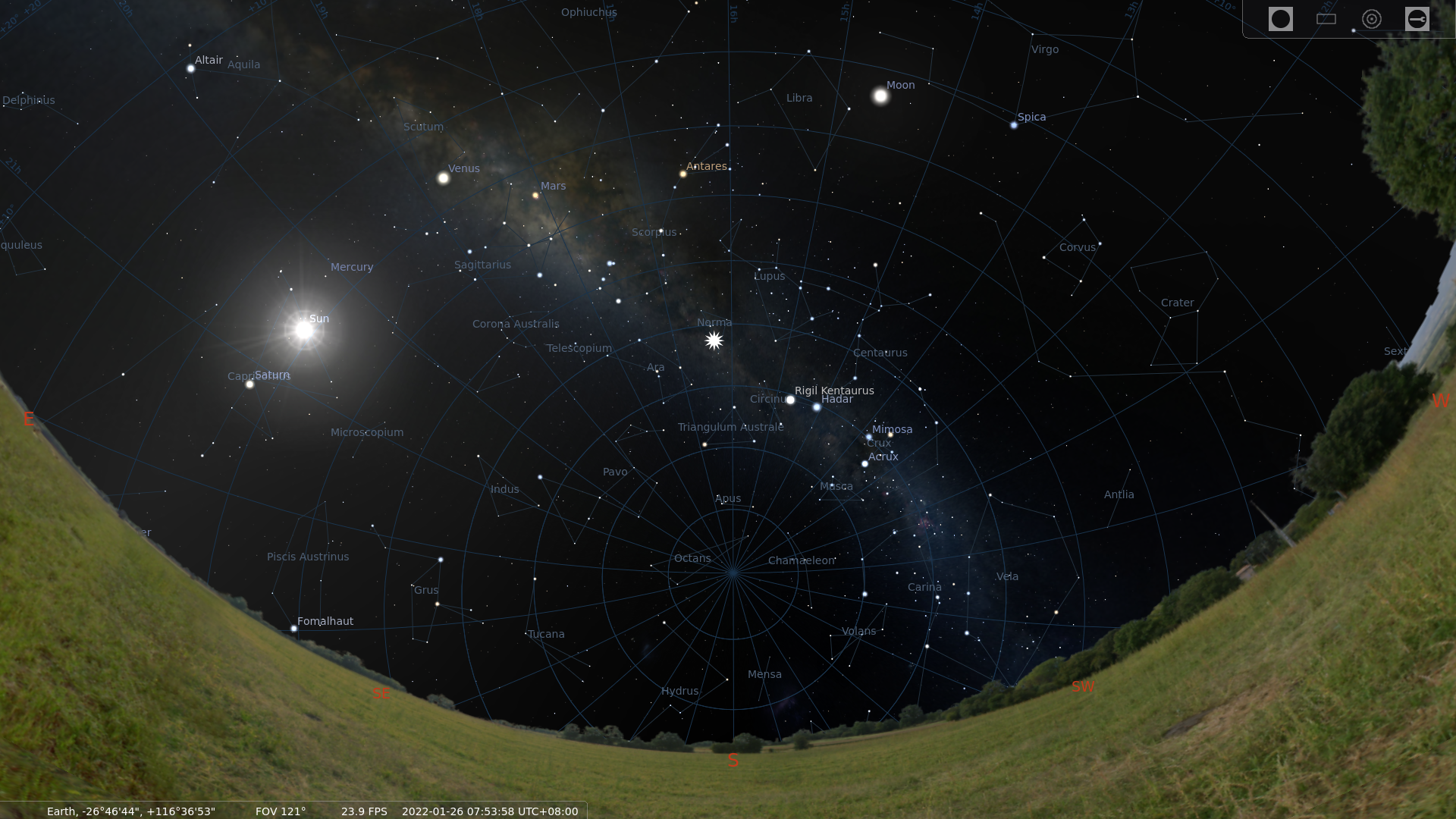 L’emplacement de la source dans le ciel en janvier 2022, marqué d’un grand marqueur d’étoile blanche. À cette période de l’année, il est au-dessus de l’horizon pendant la journée. Source de l’image : Stellarium