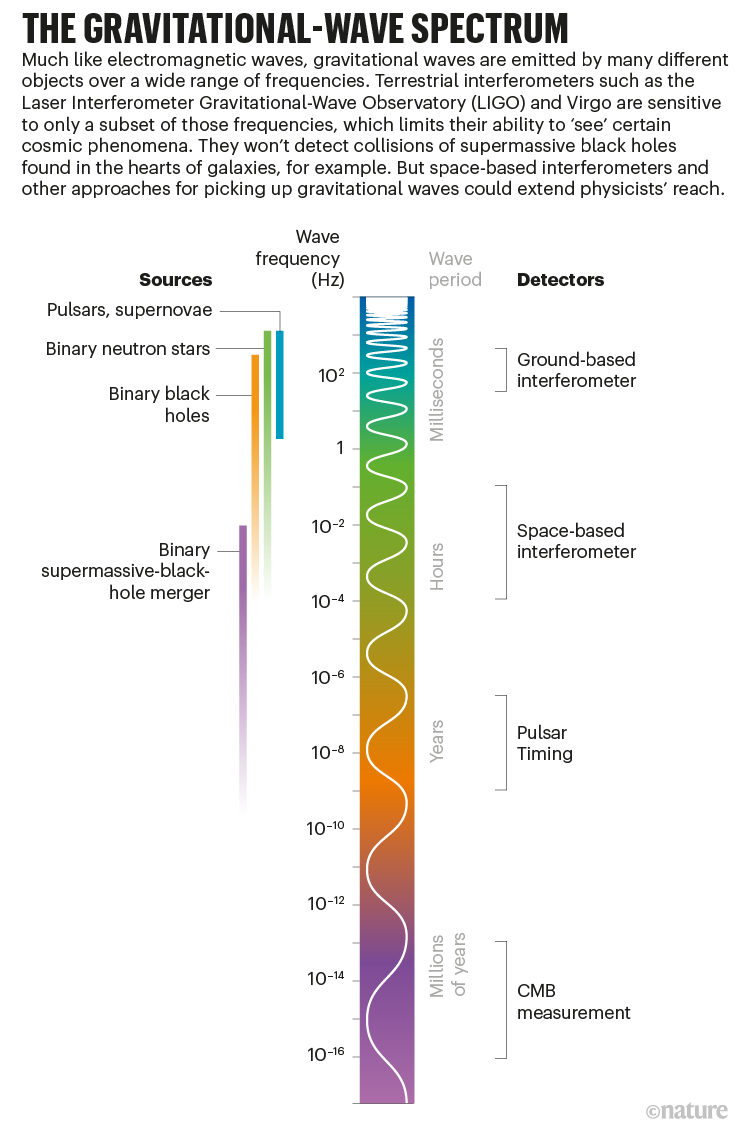 Les méthodes de détection des ondes gravitationnelles réalisée par LIRGO et VIRGO au voisinage de la centaine de hertz s'enrichit avec la méthode PTA (Pulsar Timing Arrays) et une détection au milliardième de hertz. Elle permet une détection de trous noirs supermassifs spiralants alors que LIGO-VIRGO enregistrent leurs collisions.