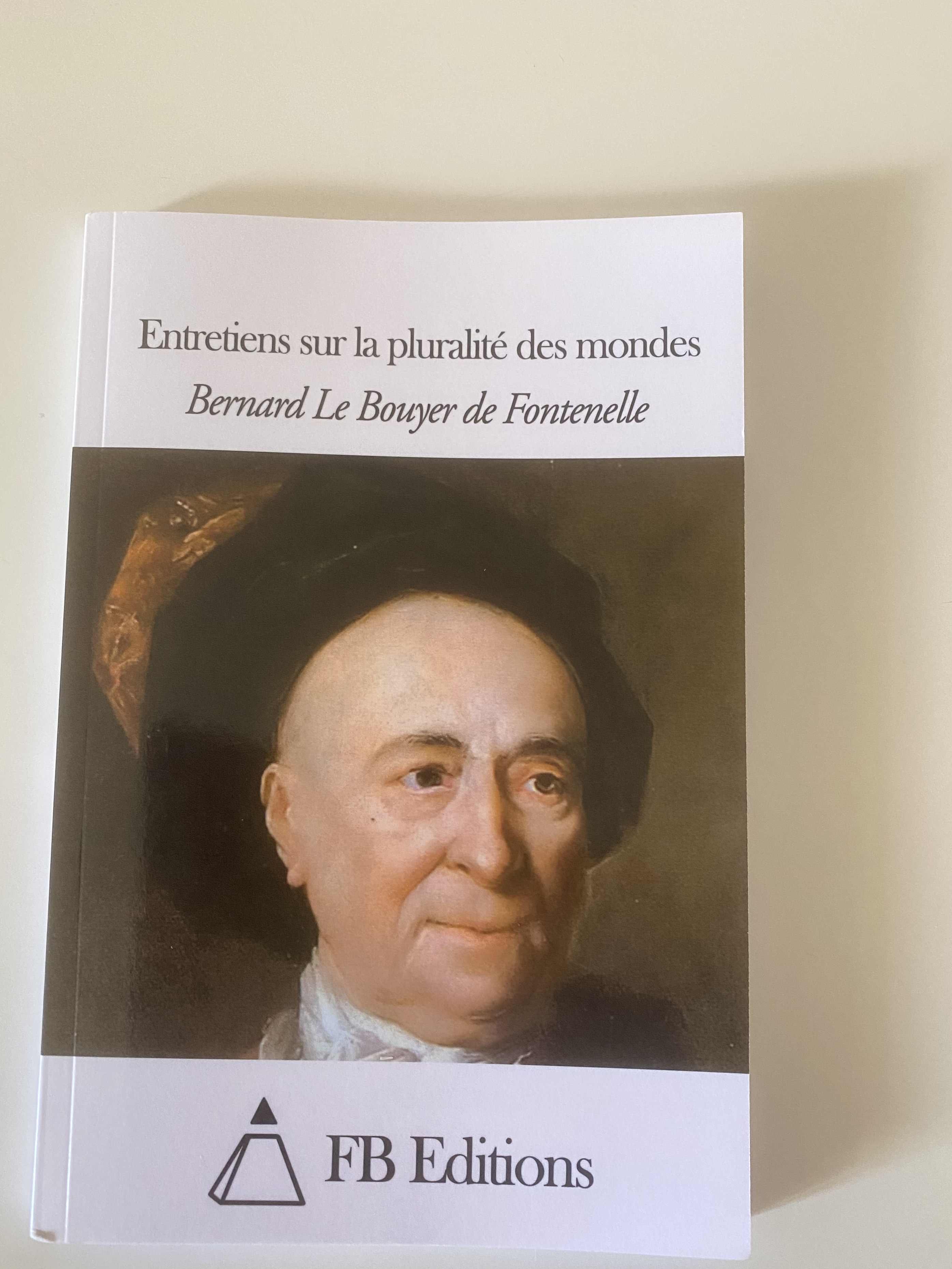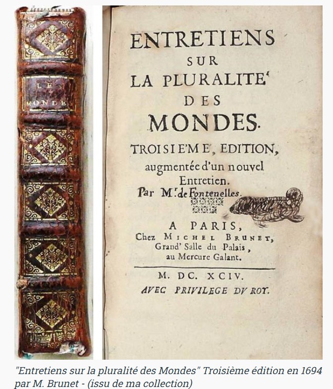 Si vous en avez l'occasion, (re)lisez ce merveilleux petit essai de Fontenelle. Il date de 1686 est est totalement précurseur. Si l'on oublie quelques petits délires sur les habitants de la Lune et des planètes, on y trouve un veritable cours d'astronomie sur les mouvements du Système Solaire et, surtout, l'intuition des exoplanètes, ce qui est remarquable pour l'époque.