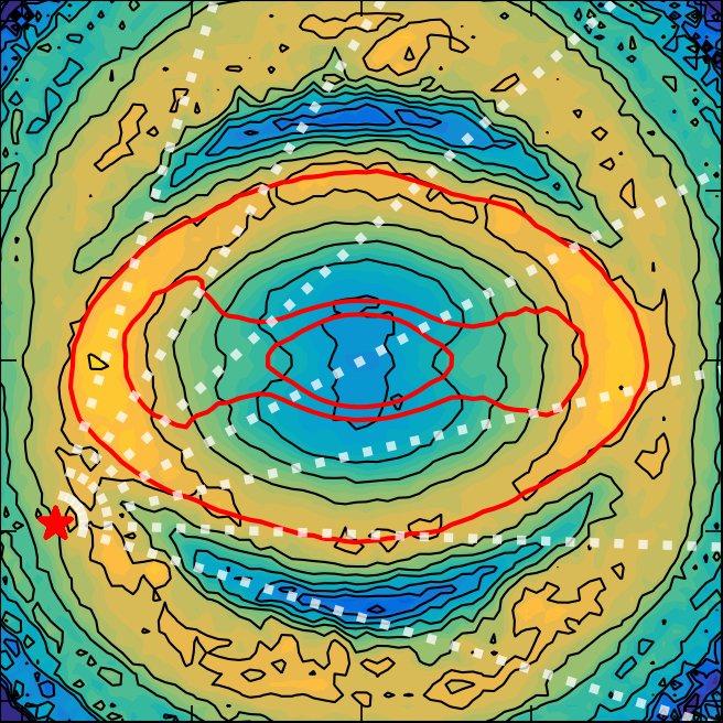 Cette image montre une carte de métallicité de la Voie lactée interne, basée sur les données orbitales calculées dans cette étude. L'étoile rouge marque la position du Soleil, tandis que les lignes pointillées blanches marquent les différentes lignes de visée. Les contours rouges montrent des niveaux de densité spécifiques pour mettre en évidence des caractéristiques importantes : une barre au milieu avec une structure en forme d'anneau autour.
