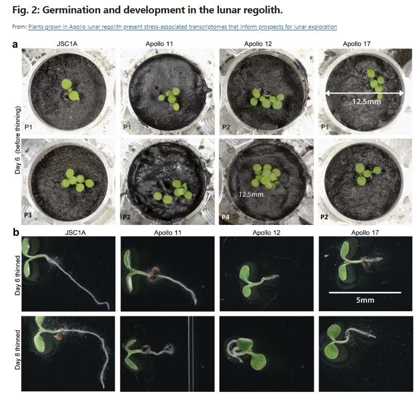 Des chercheurs de l'université de Floride ont planté du cresson de thale (Arabidopsis thaliana) dans le régolithe rapporté par les astronautes d'Apollo.
