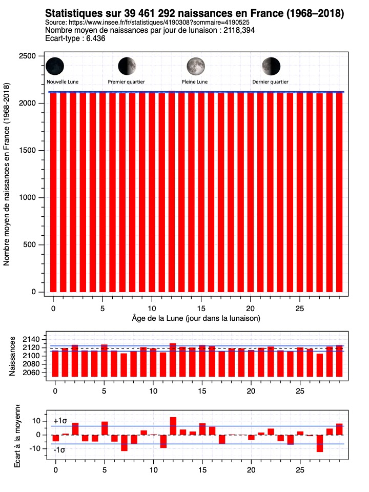 J'ai fait un programme qui lit le fichier, calcule l'âge de la Lune pour chaque date (petit algorithme simple à la fin de cet article :https://ui.adsabs.harvard.edu/abs/1964L ... P/abstract) et moyenne ensuite le nombre de naissances par jour de lunaison.