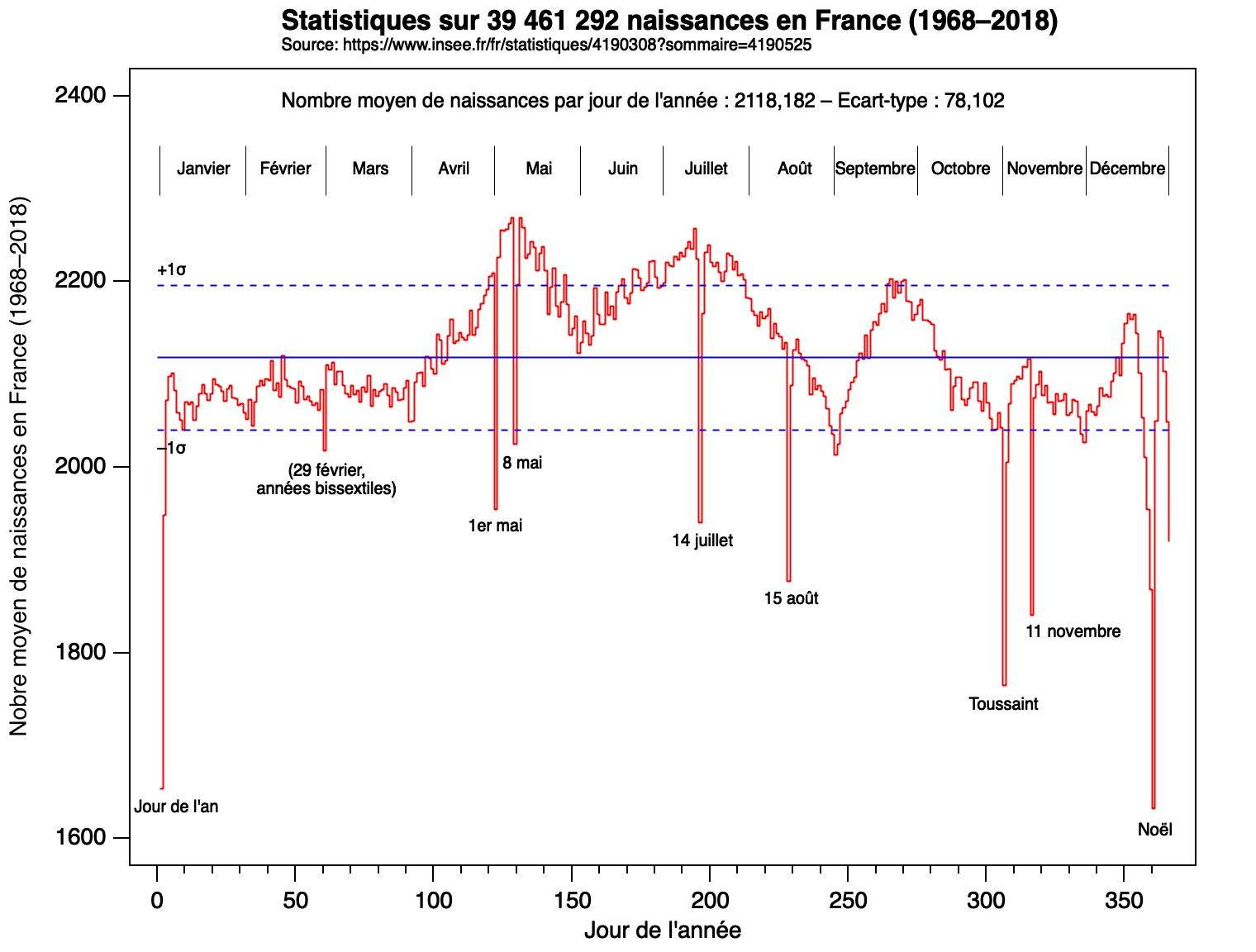 Je me suis amusé avec les statistiques des naissances en France. Sur le site de l'INSEE, on peut avoir toutes les naissances, jour par jour, sur 50 ans (1968-2018) :