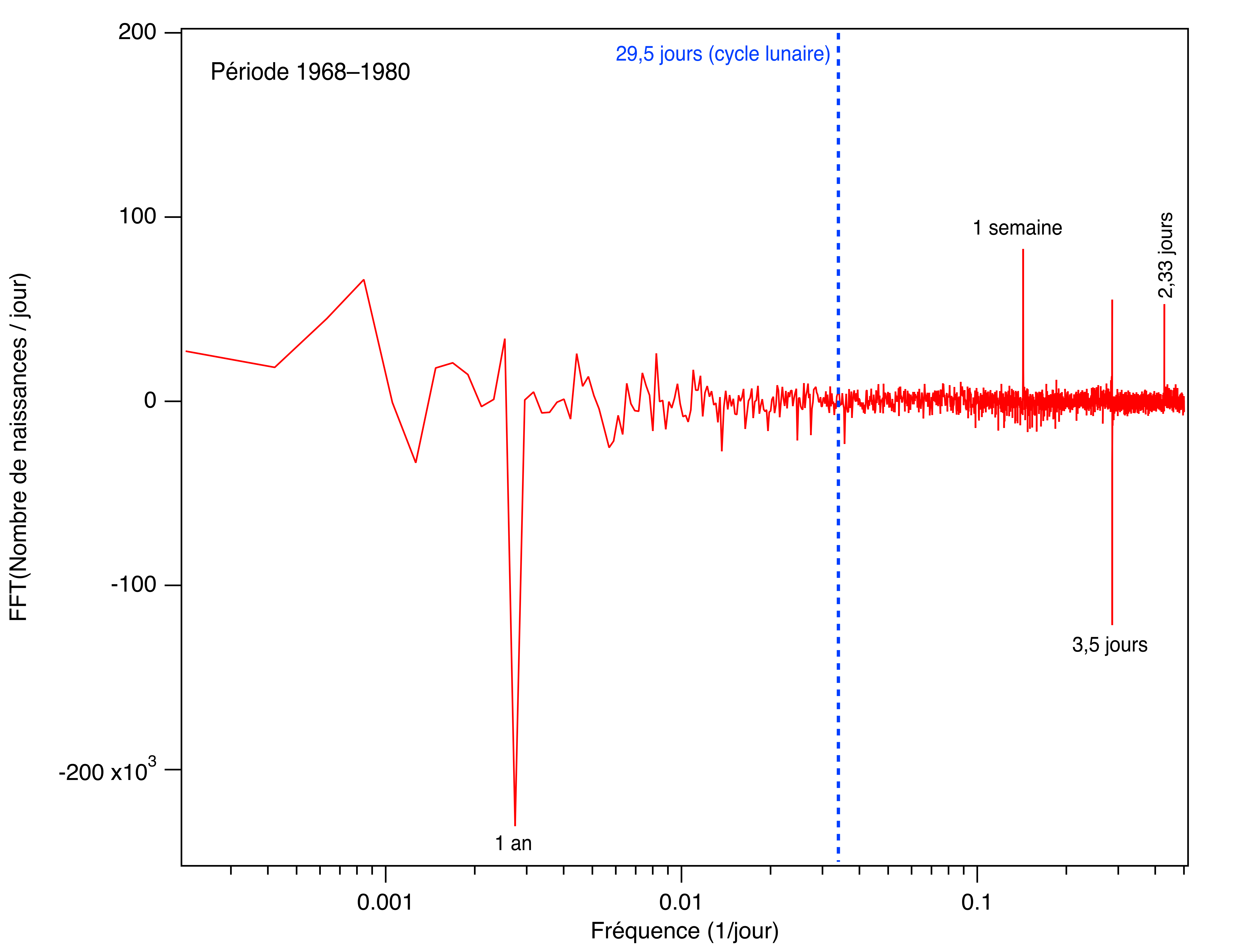 Allez, suite de la thématique "la Lune n'influence pas les naissances", cette fois via une analyse de Fourier. Si on fait la transformée de Fourier des données quotidiennes des naissances sur les 52 ans de données disponibles à l'INSEE, on obtient différentes périodes (qui s'expliquent plus ou moins), mais, fait absolument remarquable : rien, mais alors rien du tout, à la fréquence du cycle lunaire
