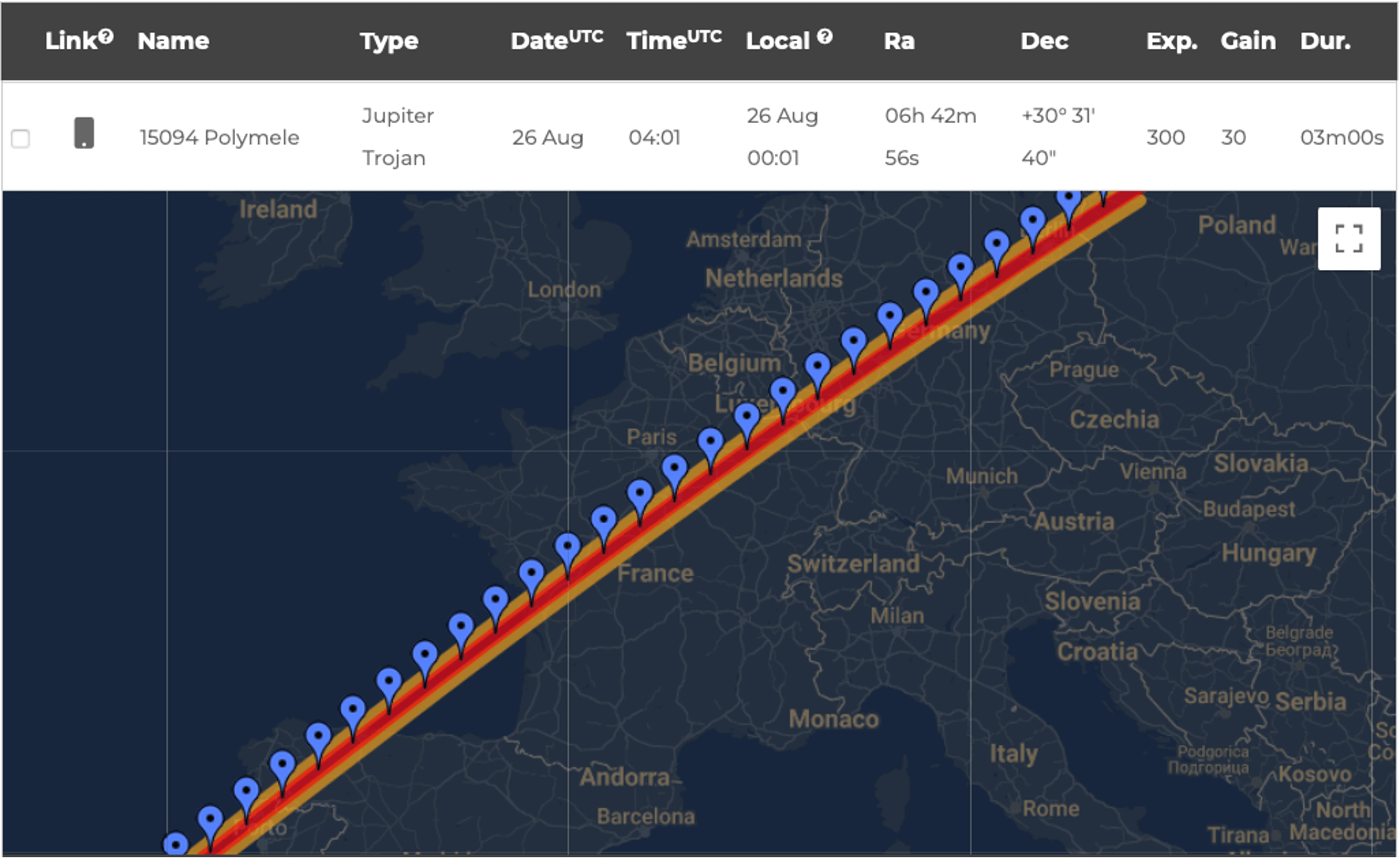 Veuillez ajouter à votre calendrier l'occultation par Polymele le 26 août (04:01 TU). Même si vous n'êtes pas sur le chemin , essayez de l'observer car l'astéroïde a une lune qui a été récemment découverte. Vous pourriez avoir de la chance et le détecter à nouveau. Il pourrait être jusqu'à 500 km du primaire, donc tous les astronomes citoyens européens devraient l'essayer.