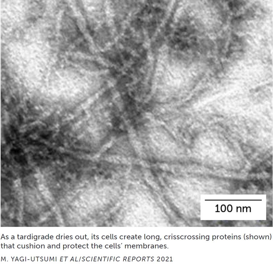 Lorsqu’un tardigrade se dessèche, ses cellules jaillissent plusieurs protéines étranges (https://journals.plos.org/plosone/artic ... ne.0044209) qui ne ressemblent à rien de ce que l’on trouve chez d’autres animaux.