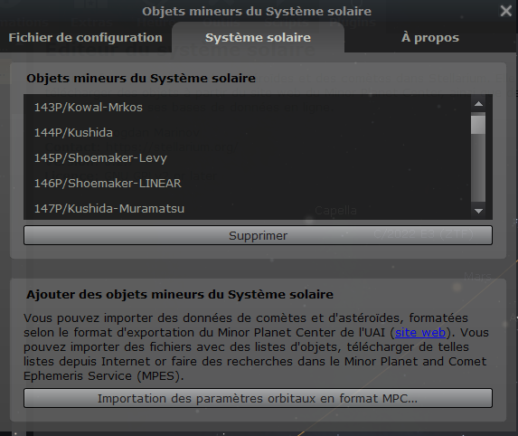 Onglet "Système solaire", "Importation des paramètres orbitaux en format MPC"