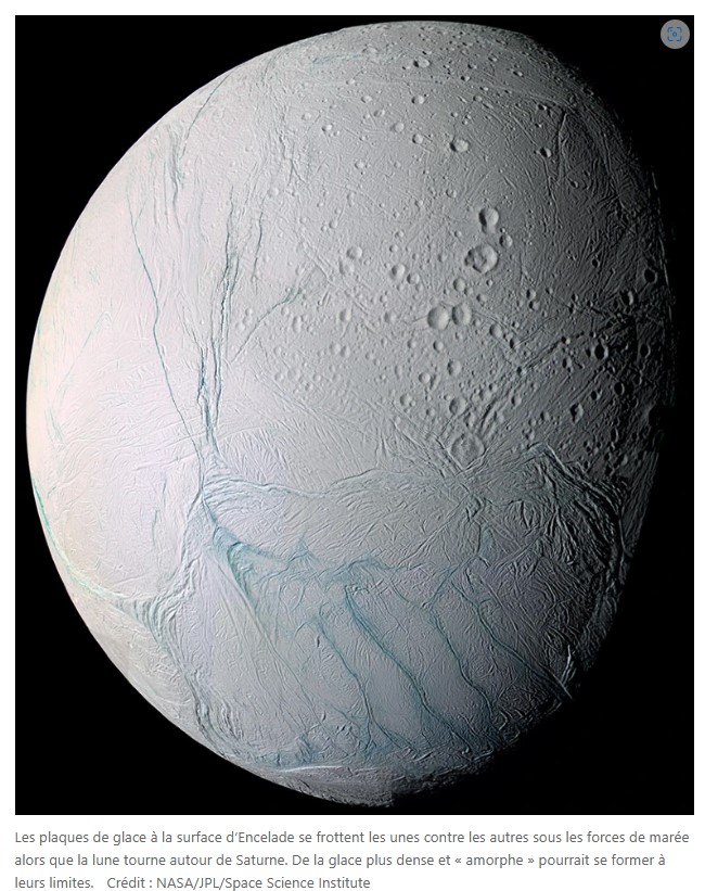 << Certaines lunes de notre système solaire, comme Europe de Jupiter et Encelade, la lune de Saturne, ont des surfaces glacées. Si deux zones glacées sur une telle lune devaient se frotter ensemble à cause des forces de marée, elles pourraient produire de la glace amorphe de densité moyenne entre elles par le même processus de cisaillement que les chercheurs ont utilisé.>>