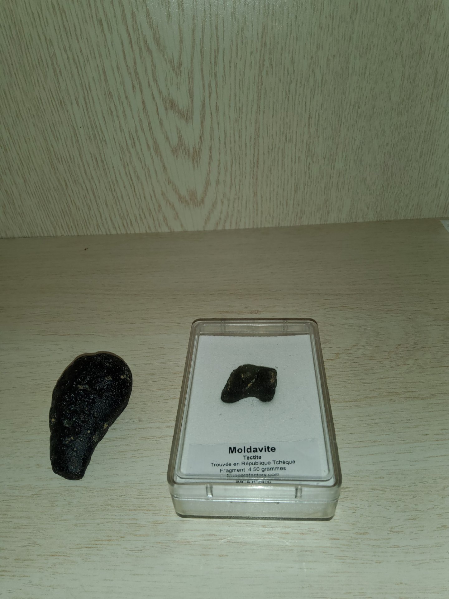 Deux tectites. Une Indochinite et un petit morceau de Moldavite: