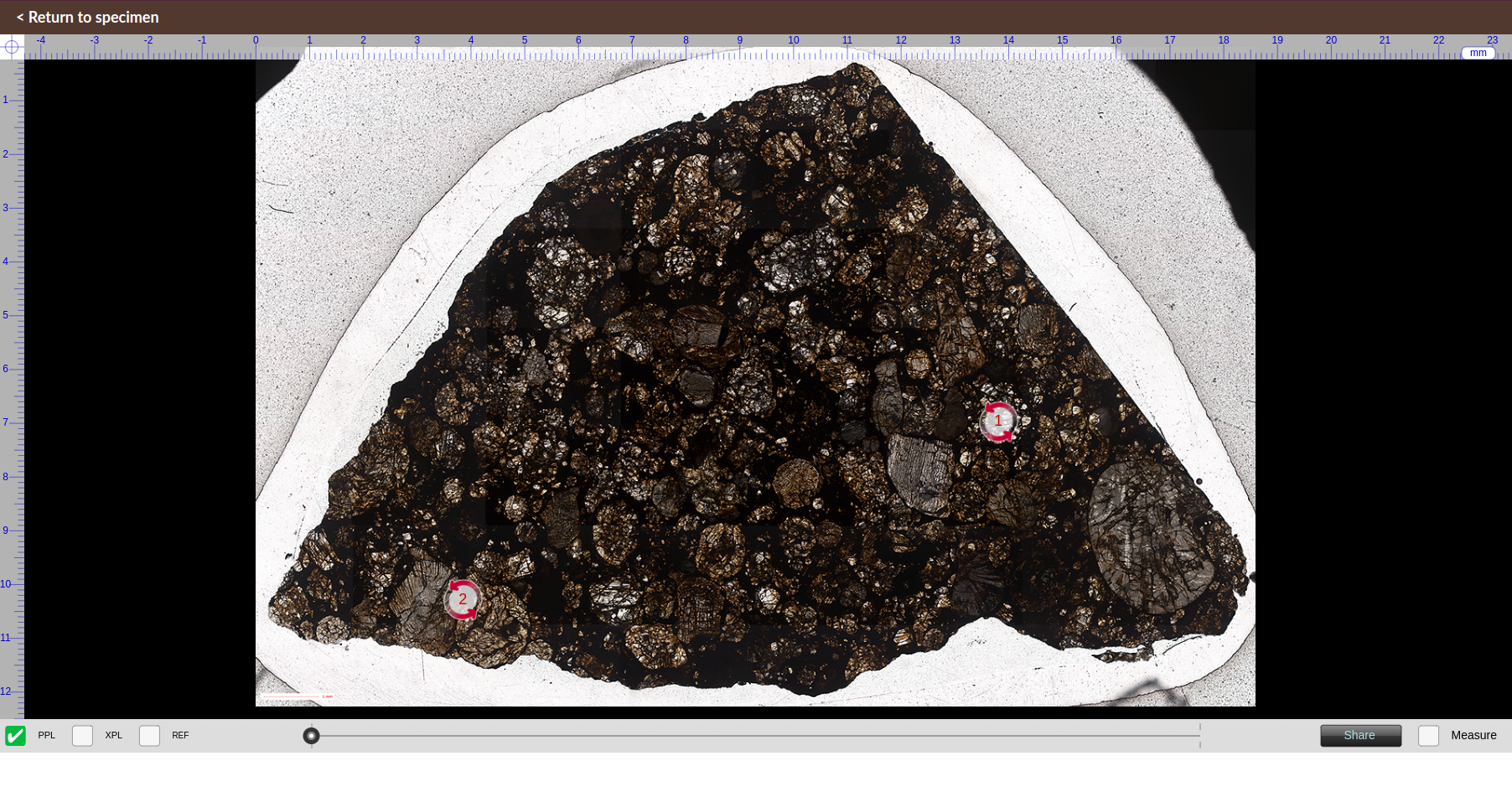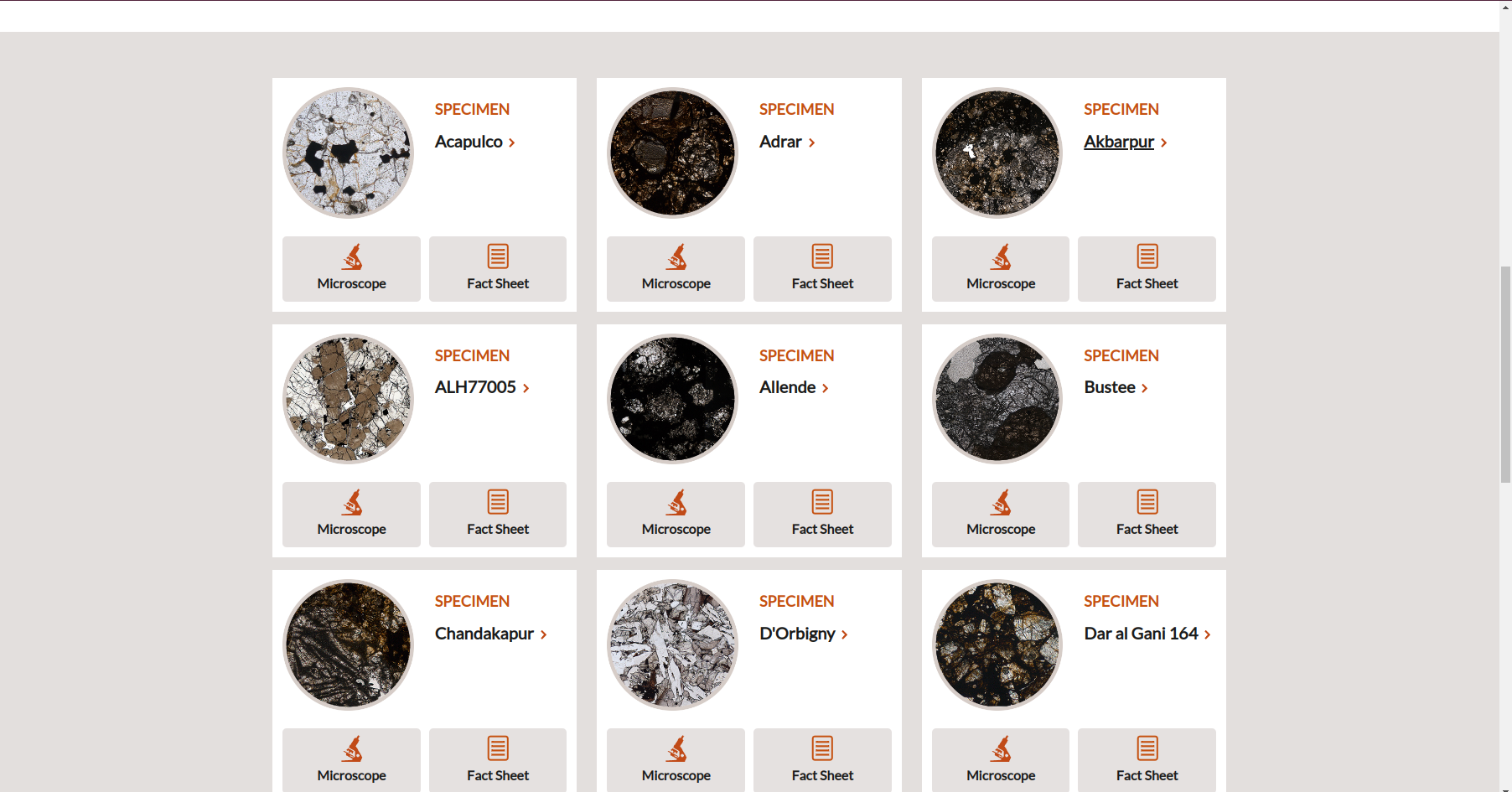 Pour faire suite à notre séance d'observation de tranches de météorites voici la possibilité de faire un peu la même chose avec un microscope virtuel avec des tranches issues d'objets très rares :