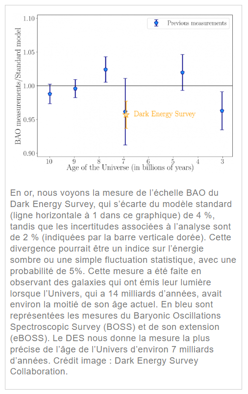 <<......Selon cette théorie, les ondes sonores se sont propagées dans l’univers primitif. Dans ces premiers stades, l’univers avait une température et une densité énormes. La pression dans ce gaz initial a essayé de pousser les particules qui l’ont formé séparément, tandis que la gravité a essayé de les rapprocher, et la compétition entre les deux forces a créé des ondes sonores qui se sont propagées depuis le début de l’univers jusqu’à environ 400 000 ans après le Big Bang. À ce moment-là, le rayonnement et la matière ont cessé d’interagir et les ondes ont été gelées, laissant une empreinte sur la distribution spatiale de la matière. Cette empreinte est observée comme une petite accumulation préférentielle de galaxies séparées par une distance caractéristique, appelée échelle del’oscillation acoustique des baryons (BAO) par les cosmologistes, et correspond à la distance parcourue par les ondes sonores au cours de ces 400 000 ans....>> https://news.fnal.gov/2024/02/new-measu ... rk-energy/