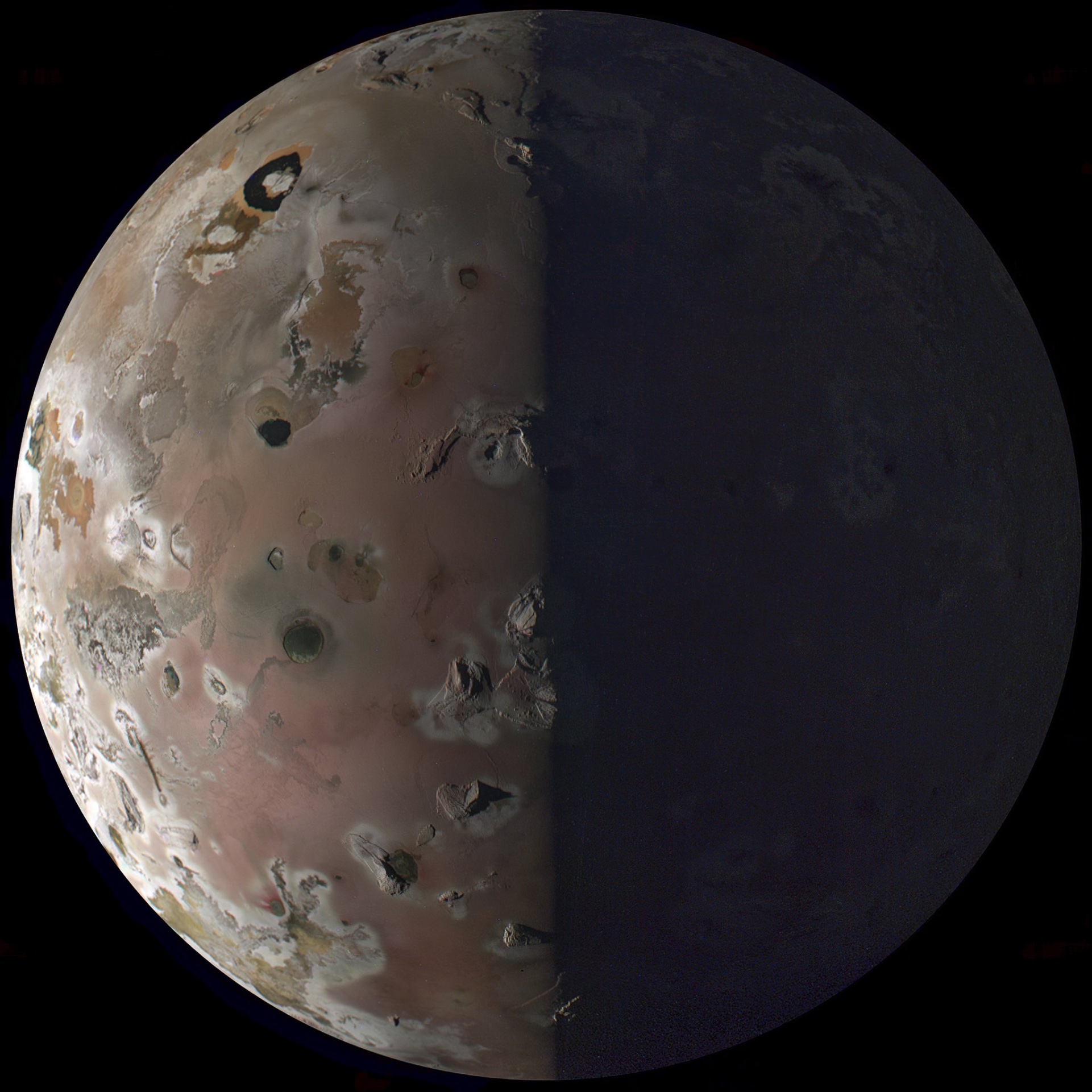 Jupiter’s moon Io with decorrelated colors and boosted to show the dark jupitershine on the right. A lot of credit goes to the JunoCam team for recovering the camera from apparent severe radiation damage.