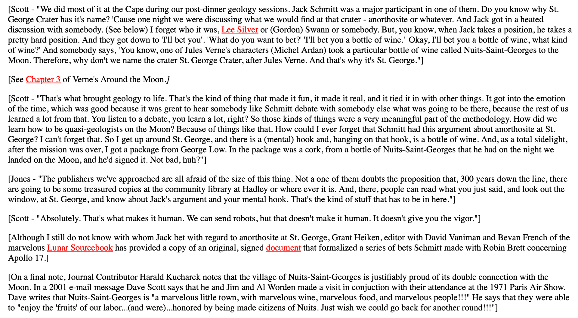 D'ailleurs ici la phrase "David Scott dépose une étiquette de la cuvée 69 Terre-Lune enfermée dans une caissette, sur le bord d’un cratère qu’il baptise “Saint-Georges” est très approximative. Ils ne nomme pas le cratère à ce moment-là, voir la retranscription du Lunar Surface Journal dans mon premier message.