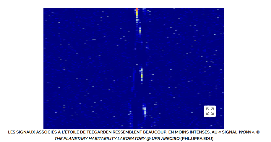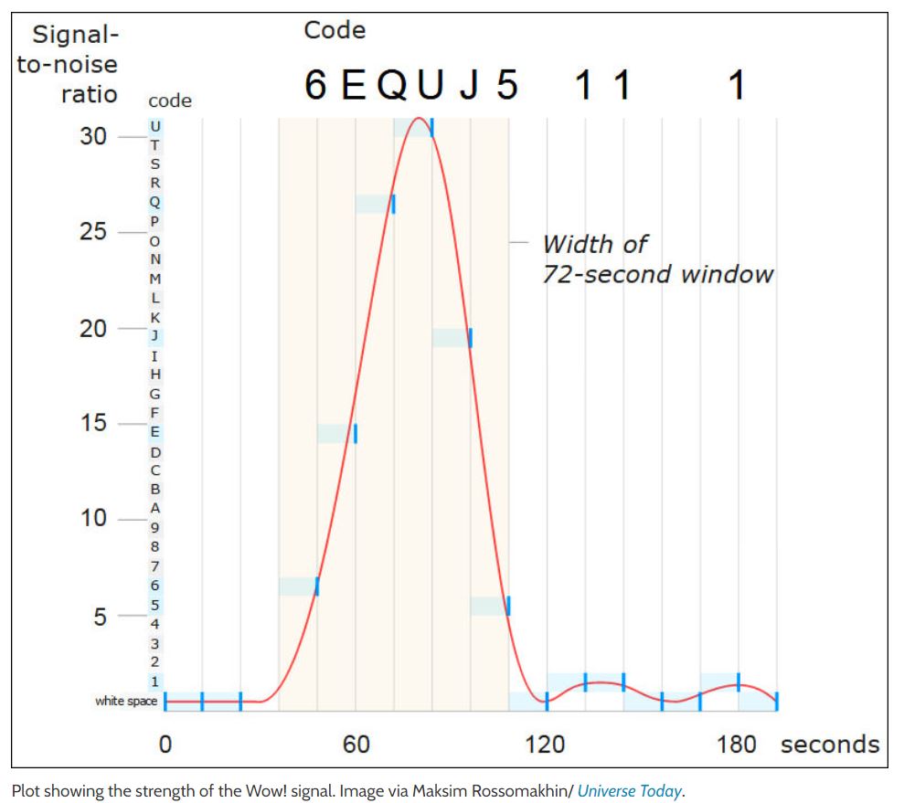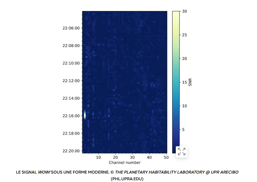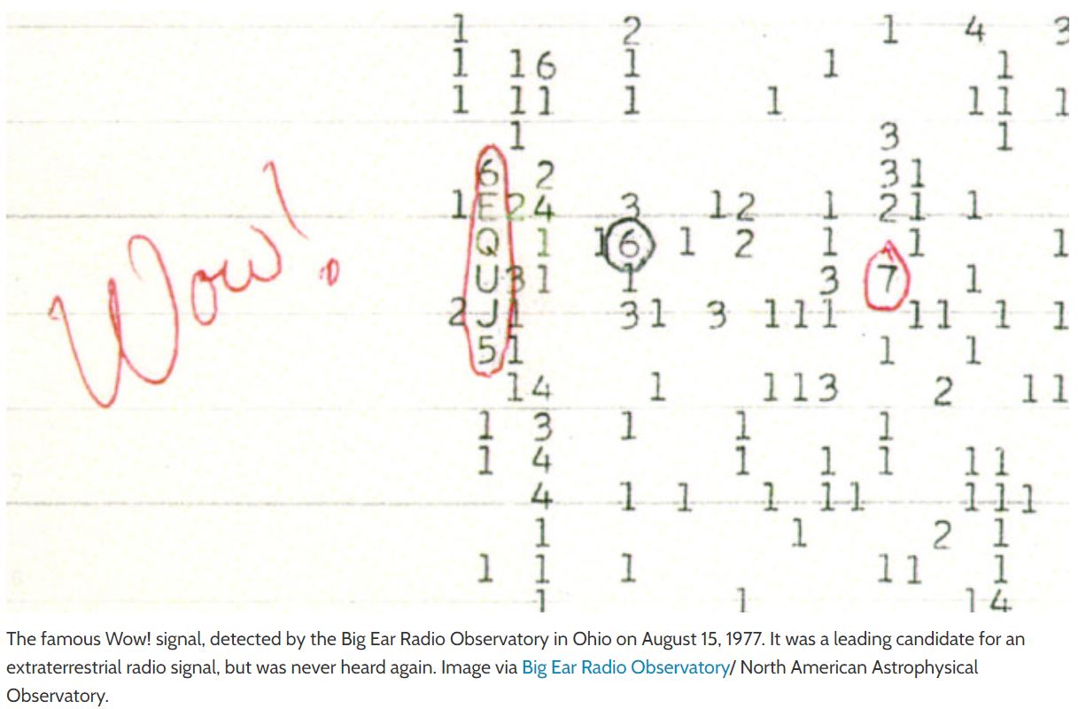 En août 1977, les astronomes ont détecté un signal radio inhabituel provenant de l’espace profond qui fait l’objet de débats concernant sa provenance. Connu sous le nom de signal Wow!,il n’a été entendu qu’une seule fois. Il a été réétudié par l'astronome amateur Alberto Caballero, l’un des fondateurs de The Exoplanets Channel sur YouTube et coordinateur du Habitable Exoplanet Hunting Project.