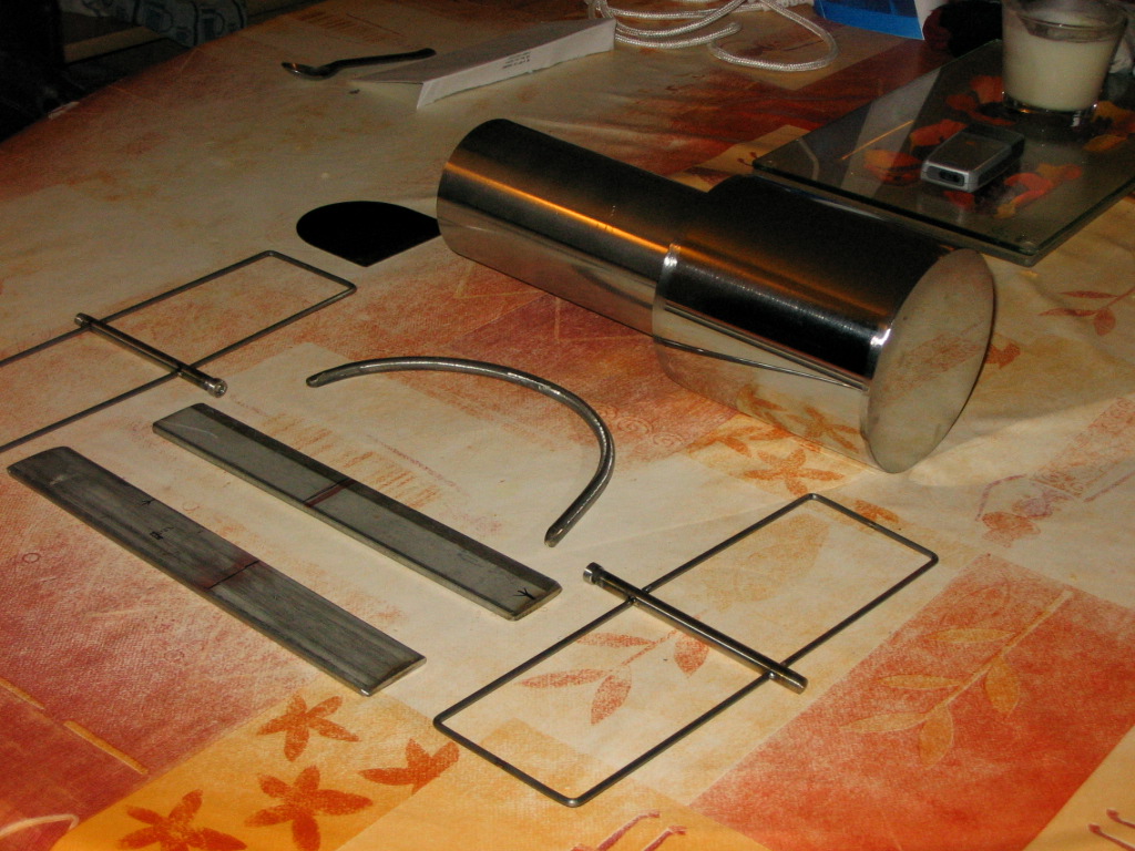J'ai terminer le polissage du corps et commencer à réaliser une épure pour le pied,pour l'instant encore en trois éléments (le fer plat et le rond de 8 m/m cintré, sur la photo) !