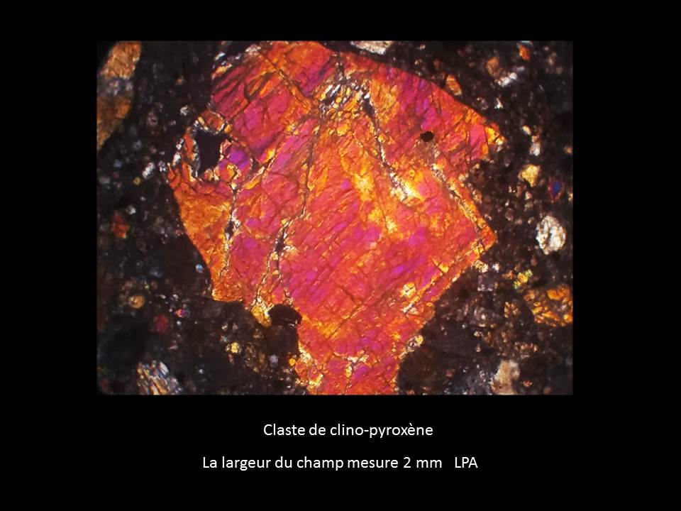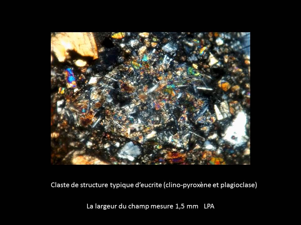 Le plus caractéristique est le claste de type eucrite (ressemblant à un basalte terrestre, cf images de l'eucrite NWA 8594 montrées ci-dessus)