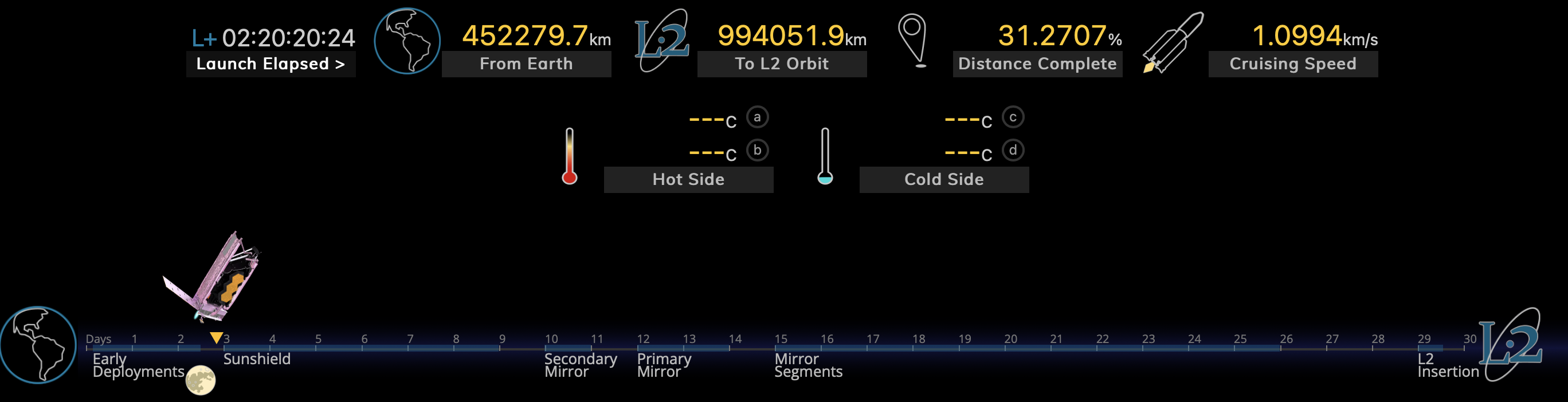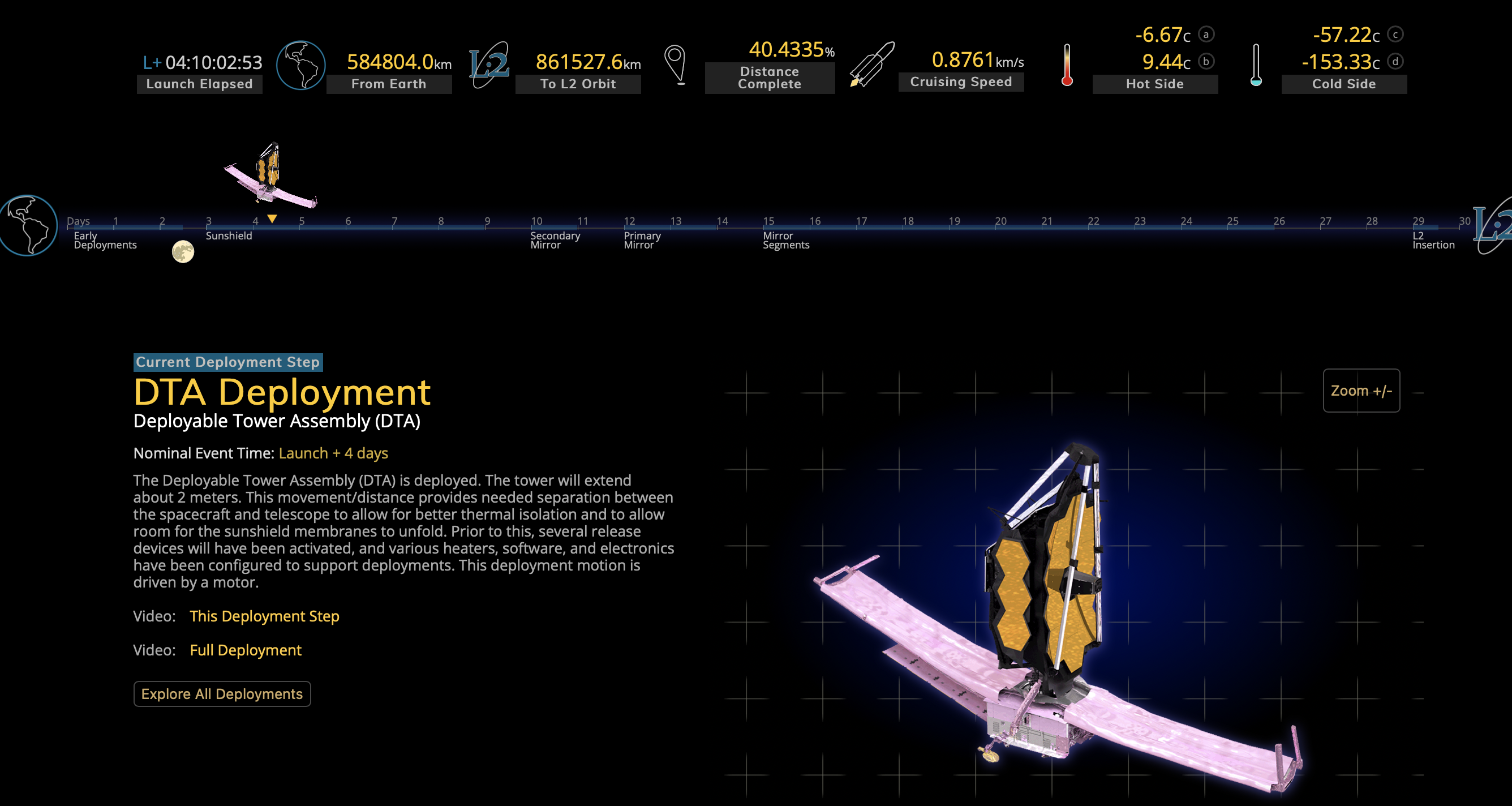 Yes ! La "tour" de 2 m éloignant le miroir du reste du satellite s'est déployée. Les températures de chaque côté du bouclier sont désormais affichées.
