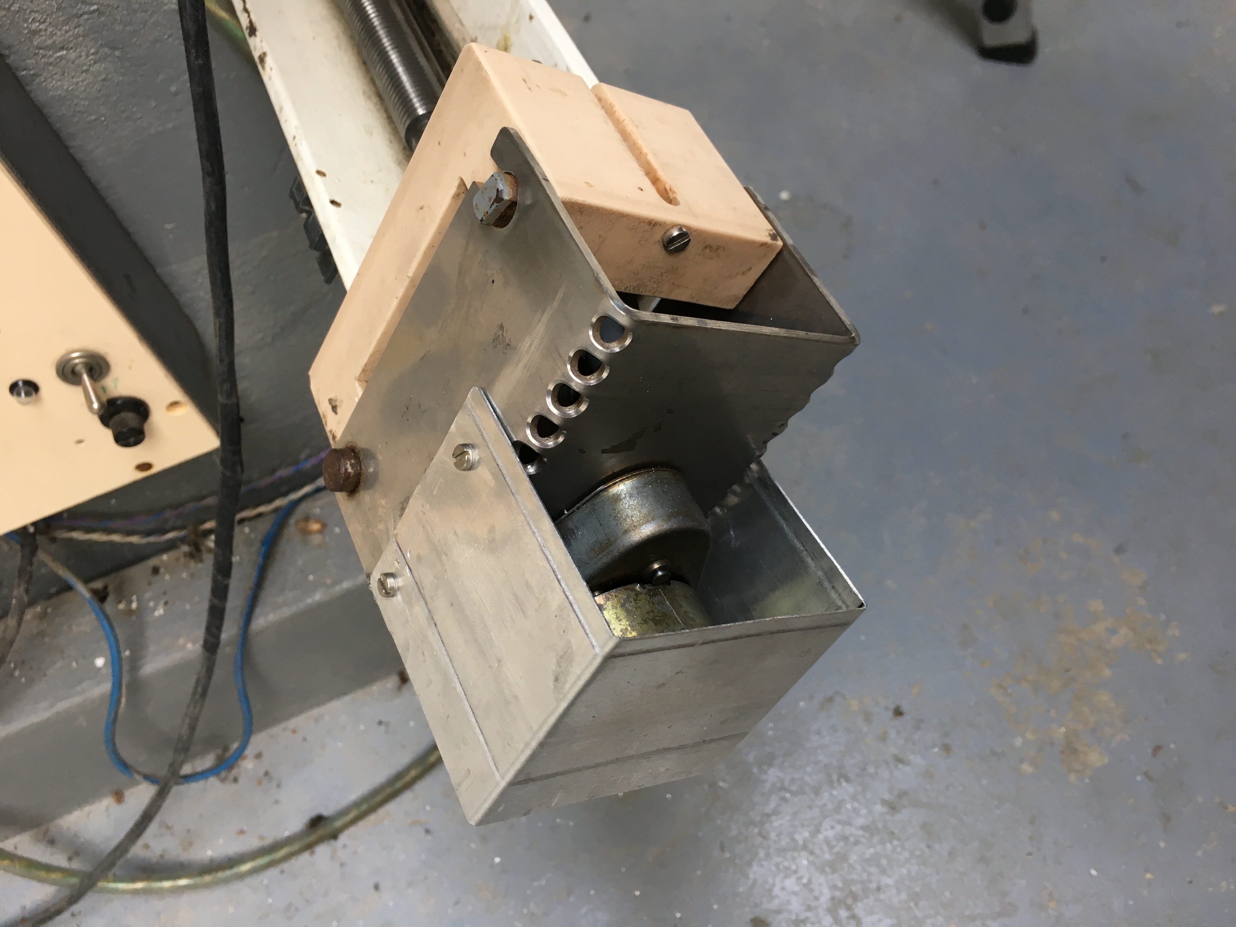 Et voilà !!! Sitôt dit, sitôt fait, Jean-Marc-Muller a foncé à la fac en fin de matinée, a fait un capot en aluminium et l'a monté cet après-midi. Donc plus de risque pour le moteur en présence du public. Il a un peu souffert pour percer (à la perceuse sur batterie) et tarauder l'acier (Valyrien ?) du support de moteur, mais ça a été, finalement.