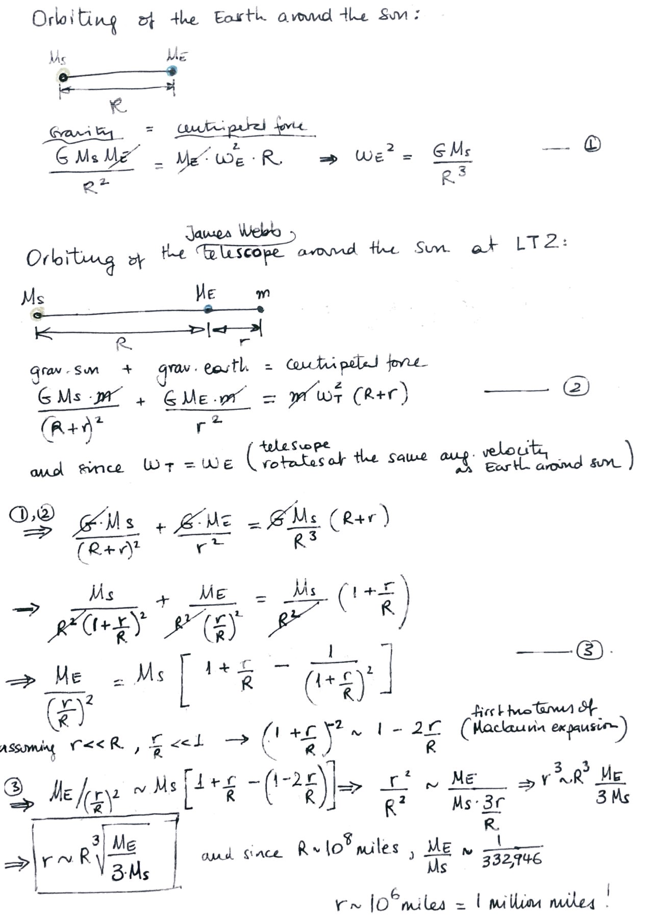 Je me suis pourtant mal exprimé dans mon précédent message : Dans cette zone de Lagrange 2, la force centripète exercée par le couple Terre - Lune (leur centre de gravité commun) et le Soleil sur le JWST est exactement la même que la force centrifuge qui devrait éjecter le JWST vers l'espace, mais le maintient sur sa trajectoire autour du soleil, à la même vitesse angulaire que la Terre autour du Soleil, mais à environ 1 500 000 km de la Terre.
