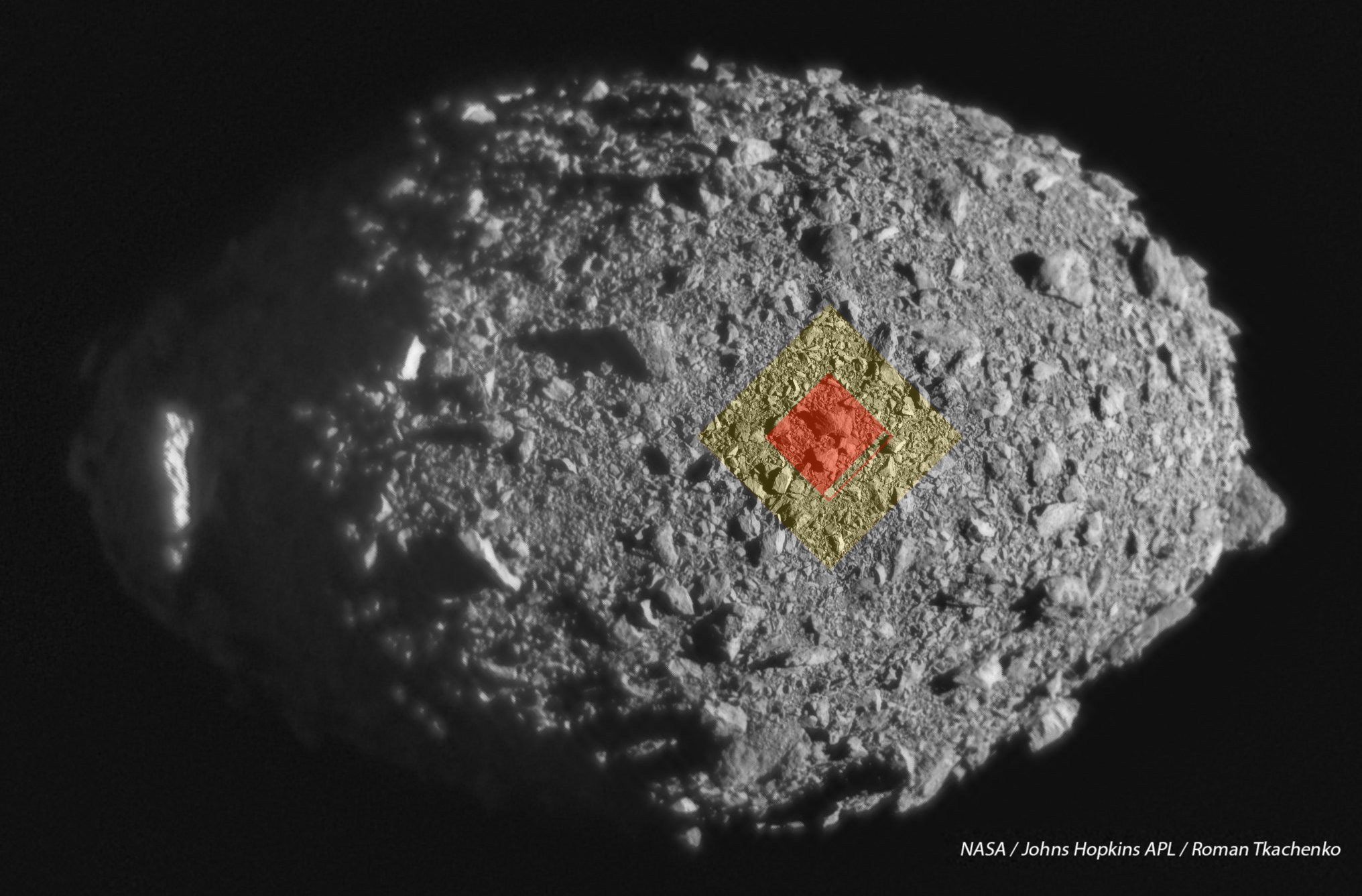 […] en jaune la dernière photo complète prise par la sonde #DART, à 12 kilomètres de la cible, et en rouge la zone couverte par la dernière photo incomplète, prise à 6 kilomètres.