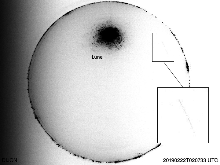 J'ai eu l'image de Dijon par Sylvain Bouley. Je la mets en négatif avec contraste amélioré et zoom car, à cause de la Lune, c'est en fait très difficile à voir. Mais le bolide est bien là !