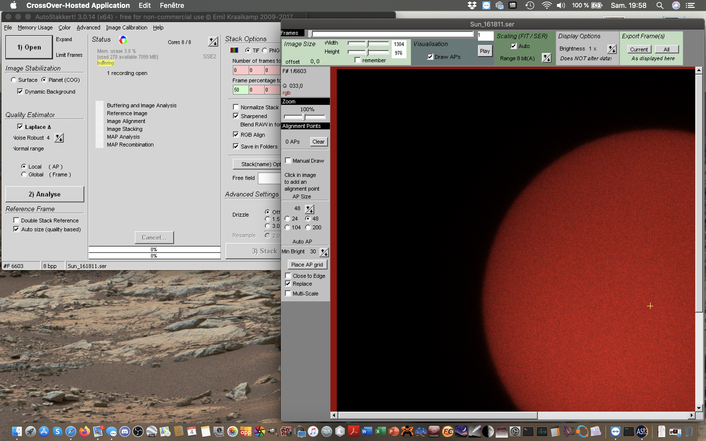 Voici une copie d'écran avec Autostakkert 3 qui tourne parfaitement sur mon Mac :