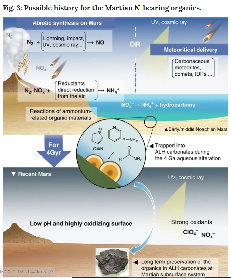 Cet article traite de carbonates vieux de 4 milliards d'années de la météorite martienne Allan Hills 8400 contenant des composants organiques indigènes contenant de l'azote (N).