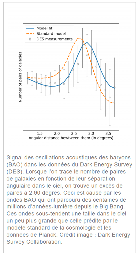 <<......Selon cette théorie, les ondes sonores se sont propagées dans l’univers primitif. Dans ces premiers stades, l’univers avait une température et une densité énormes. La pression dans ce gaz initial a essayé de pousser les particules qui l’ont formé séparément, tandis que la gravité a essayé de les rapprocher, et la compétition entre les deux forces a créé des ondes sonores qui se sont propagées depuis le début de l’univers jusqu’à environ 400 000 ans après le Big Bang. À ce moment-là, le rayonnement et la matière ont cessé d’interagir et les ondes ont été gelées, laissant une empreinte sur la distribution spatiale de la matière. Cette empreinte est observée comme une petite accumulation préférentielle de galaxies séparées par une distance caractéristique, appelée échelle del’oscillation acoustique des baryons (BAO) par les cosmologistes, et correspond à la distance parcourue par les ondes sonores au cours de ces 400 000 ans....>> https://news.fnal.gov/2024/02/new-measu ... rk-energy/