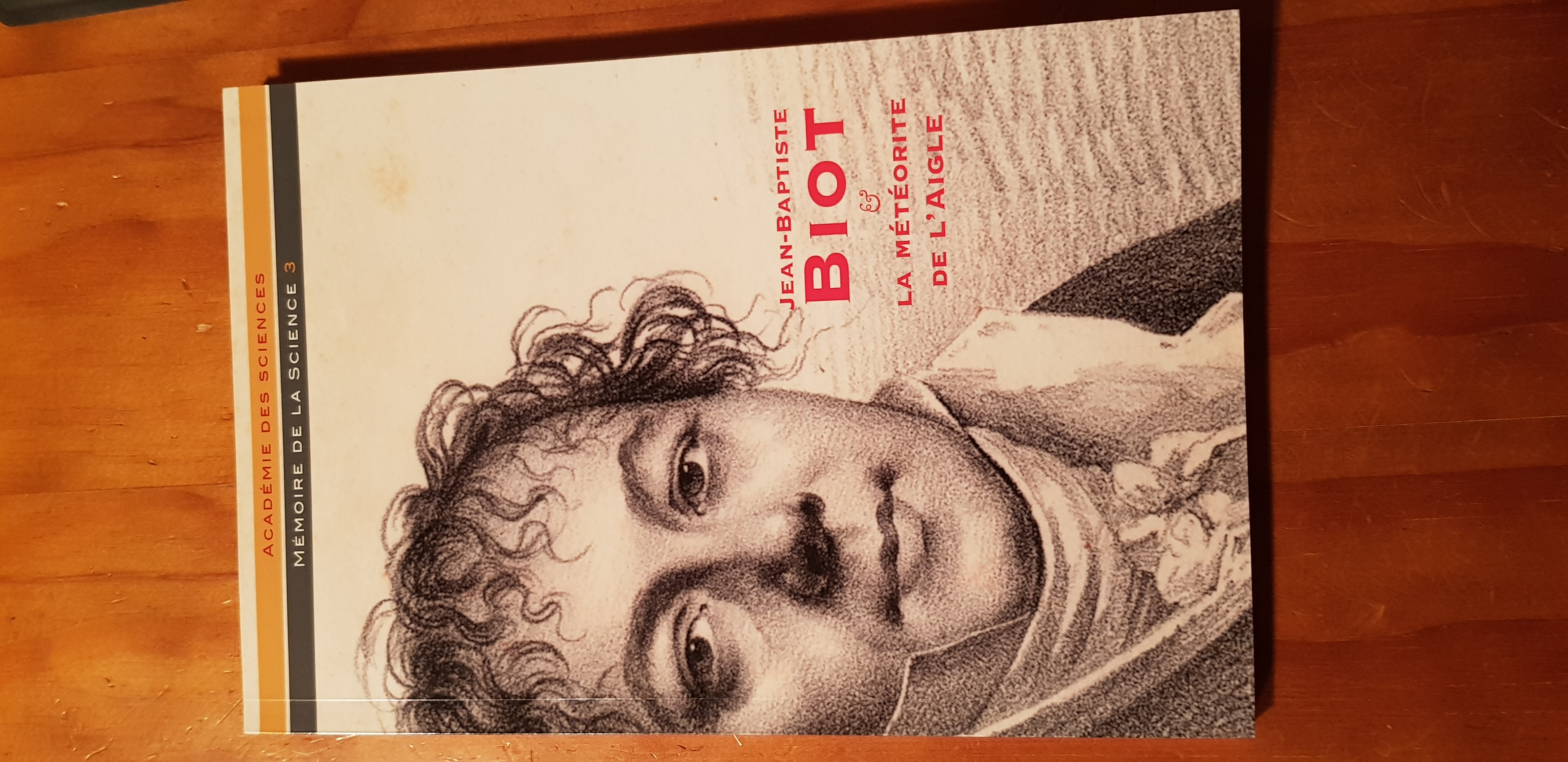 Le 26 avril 1803 (6 floréal an XI) des pierres tombent du ciel dans les environs de l’Aigle (Orne - c'est en Normandie :-) ). Cet événement est-il un phénomène réel observé par des témoins dénués de superstition ? Le 26 juin 1803 (7 messidor an XI) Jean-Baptiste Biot est chargé par le ministre de l'Intérieur d’enquêter sur cette affaire. Le 18 juillet 1803 suivant (29 messidor an XI), il rend compte à la classe des sciences mathématiques et physiques de l’Institut de son voyage à l'Aigle. Son mémoire, ici reproduit en fac-similé, est un modèle de rigueur scientifique, de perspicacité et de finesse. Ses conclusions claires mettent un point final à la controverse sur l’origine extraterrestre des météorites. Écrit dans un très beau style, il mérite d'être relu.