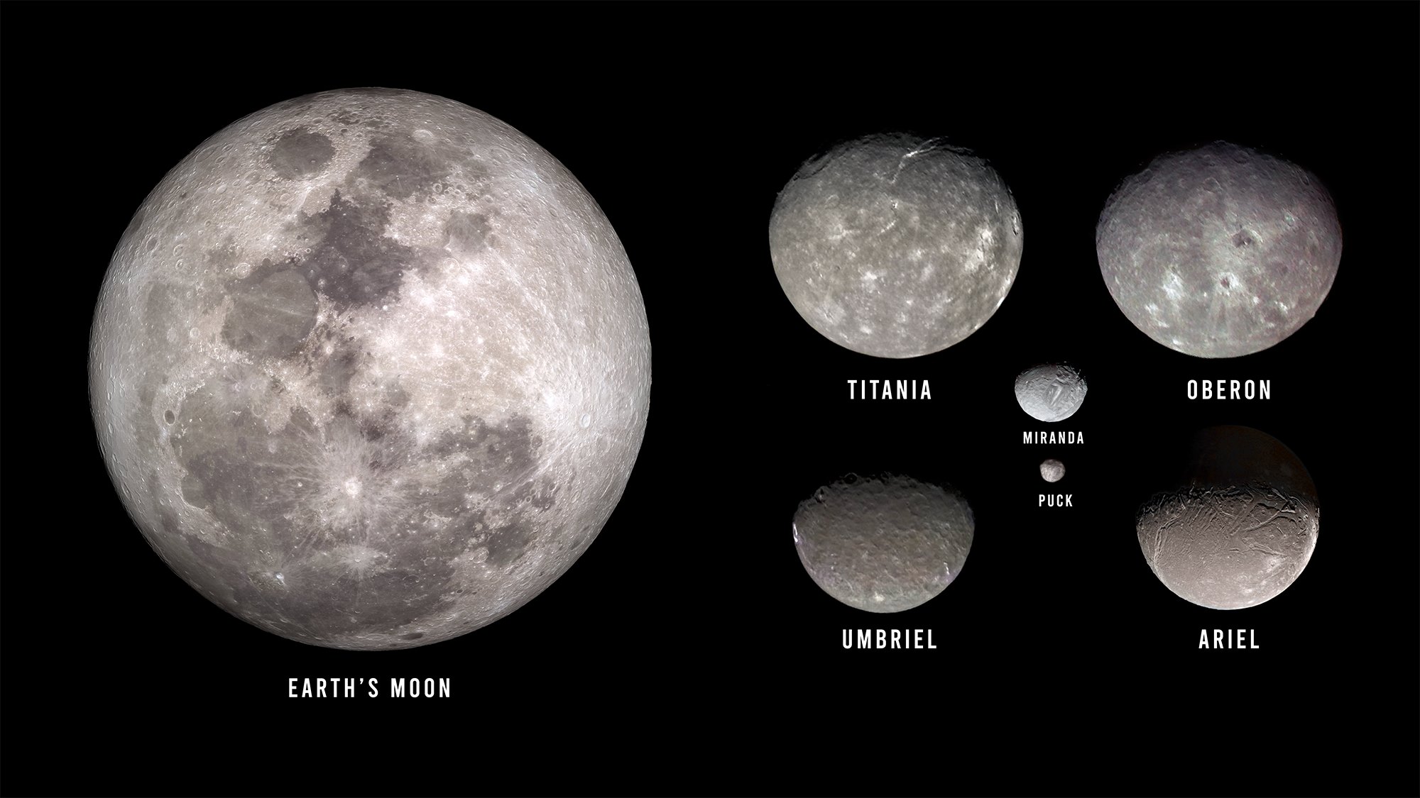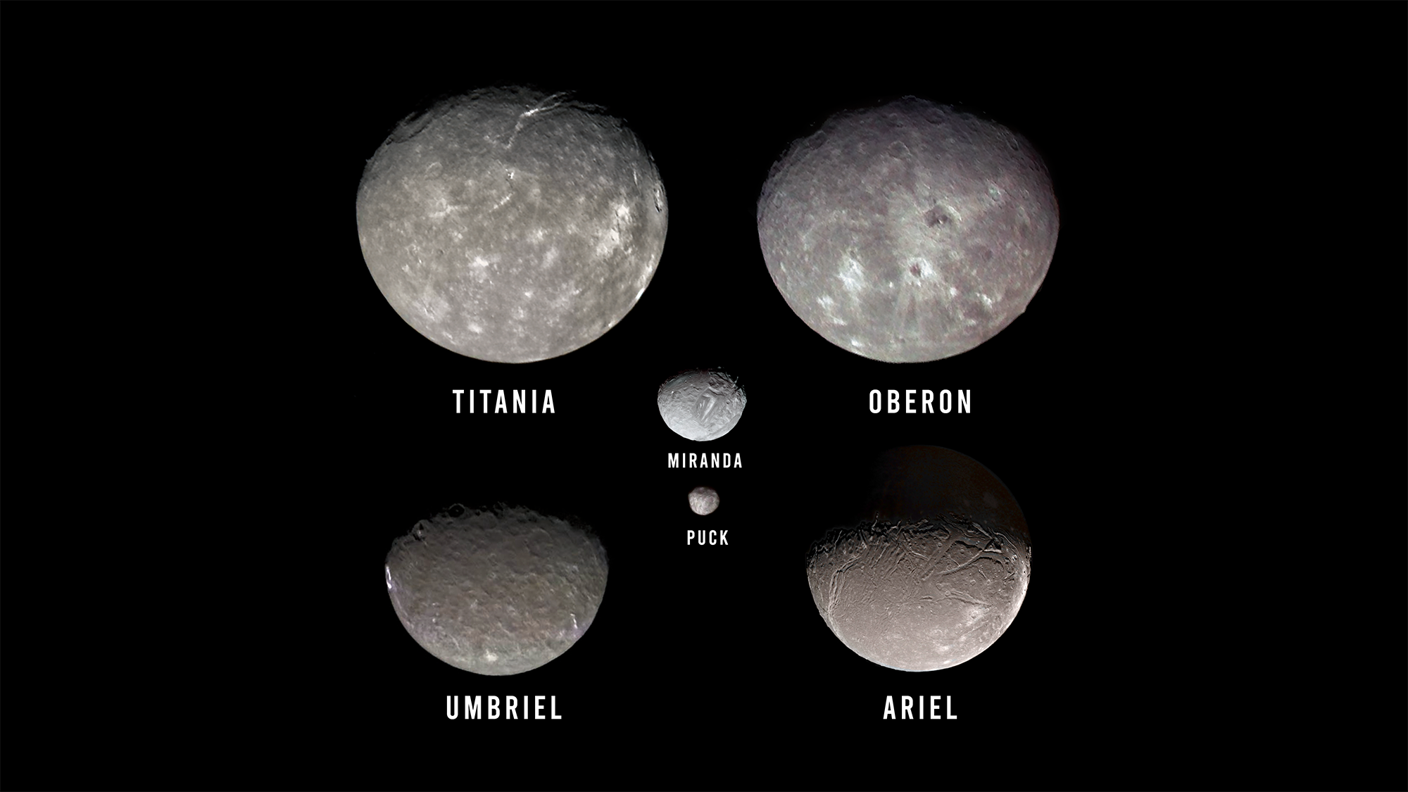 L'occasion de réviser les 6 principales lunes (sur 27 connues) de cette lointaine planète, vues par Voyager 2 en 1986.