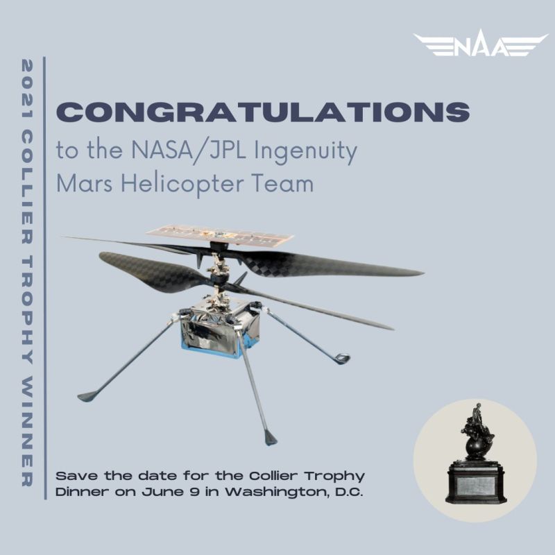 La NAA ( National Aeronautic Association) a le plaisir d’annoncer que l’équipe de l’hélicoptère martien Ingenuity de la NASA Jet Propulsion Laboratory a reçu le Prix Robert J. Collier 2021 (https://fr.wikipedia.org/wiki/Troph%C3%A9e_Collier) pour "le premier vol motorisé et contrôlé d'un aéronef sur une autre planète, ouvrant ainsi le ciel de Mars et d'autres mondes aux futures découvertes et explorations scientifiques.".