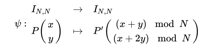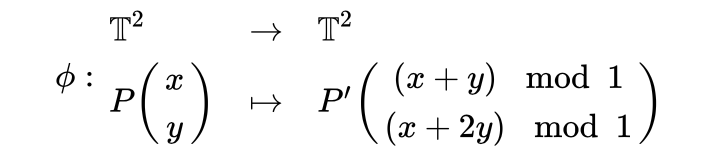 Il s'agit d'une application due au mathématicien russe Vladimir Arnold. C'est une transformation qui s'applique dans l'espace carré périodique (ce qui définit en fait un tore, mais peu importe) de taille 1 : un carré dont les coordonnées vont de 0 à 1 en x et y ; quand on dépasse 1, on revient de l'autre côté, comme Pacman. Un point (x,y) de cet espace est transformé comme suit :