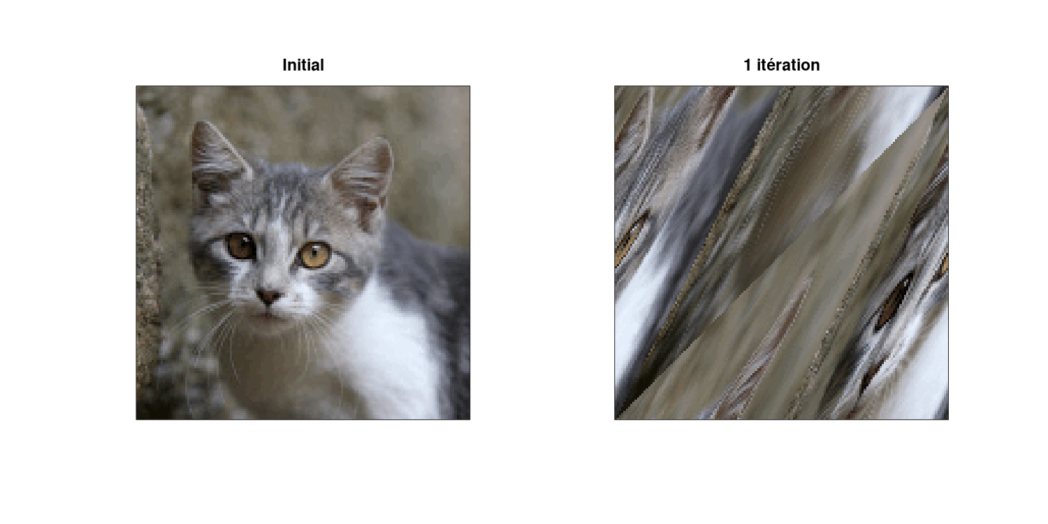 C'est la version "discrète" (dans le sens où on a un ensemble de points fini et régulièrement espacés). L'application devient déterministe (et non plus chaotique), mais reste surprenante. L'application successive de la transformation détruit rapidement l'image. Mais, périodiquement, l'image de départ se reconstitue. À certaines itérations, on aperçoit aussi le motif. Et la période dépend du nombre de pixels, mais n'est pas prévisible.