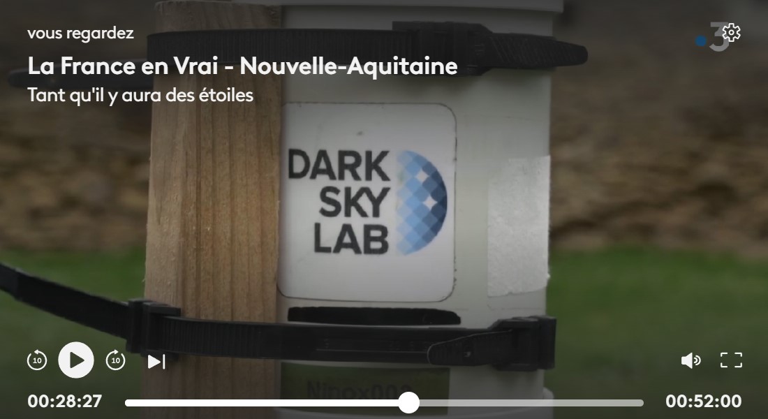 Un très beau reportage diffusé le 4/11, poétique, d'une certaine quiétude en Nouvelle Aquitaine. On y parle de pollution lumineuse, ses impacts, sa mesure avec le Ninox 003 de Dark Sky Lab (https://www.darkskylab.com/metrology.html), et de la décision de Rochechouart d'éteindre ses lumières la nuit.