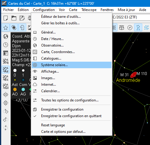 Menu "Configuration", "Système solaire" :