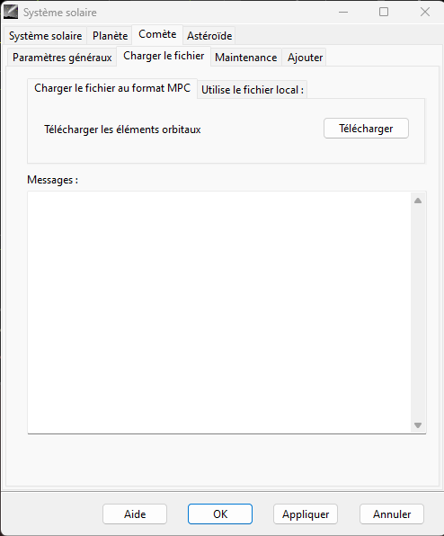 Onglets "Comète" "Charger le fichier", bouton "Télécharger":