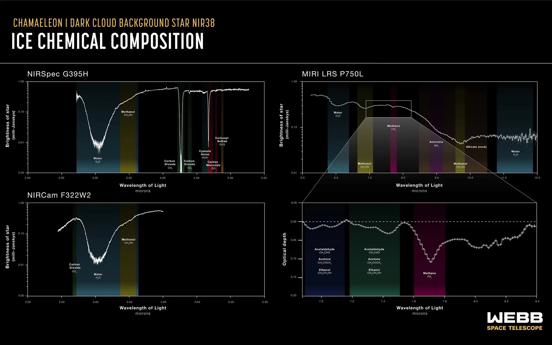 Les JWST étudie en infrarouge les nuages moléculaires denses et identifie un certain nombre de molécules organiques formées sur les grans glacés. Cela devrait nous en apprendre beaucoup sur la chimie prébiotique dans l'Univers.